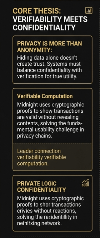 Je me souviens quand j'ai commencé à explorer des projets axés sur la confidentialité dans la crypto, je pensais que l'objectif principal était simple. Cacher les transactions et tout fonctionnerait. À l'époque, il semblait logique que l'anonymat seul entraînerait l'adoption. Mais au fur et à mesure que je passais plus de temps à comprendre comment ces systèmes fonctionnent, j'ai remarqué un écart. Cacher des données ne crée pas automatiquement de la confiance. Si les utilisateurs et les développeurs ne peuvent pas vérifier ce qui se passe en coulisses, alors la confidentialité commence à entrer en conflit avec l'utilisabilité. Cette réalisation a changé la façon dont j'évalue ces projets. Maintenant, je regarde au-delà de l'idée de confidentialité elle-même et me concentre sur la question de savoir si un système peut équilibrer la confidentialité avec la vérifiabilité d'une manière qui fonctionne réellement dans des environnements réels. Ce changement de réflexion est exactement la raison pour laquelle Midnight Network a attiré mon attention. Pas parce que la confidentialité est un nouveau récit, mais parce qu'elle soulève une question plus pratique. Une blockchain peut-elle garder les transactions privées tout en prouvant que tout ce qui s'y passe est valide ? En d'autres termes, pouvez-vous cacher les détails sans perdre confiance dans le résultat ? C'est un problème plus difficile qu'il n'y paraît, et c'est là que la plupart des solutions de confidentialité peinent. Alors, la vraie question devient de savoir si Midnight peut transformer la confidentialité en quelque chose de fonctionnel plutôt que simplement théorique.