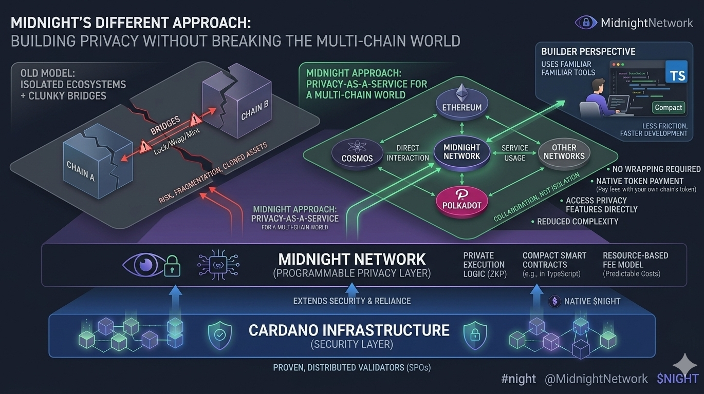 We’ve all seen how bridges work: lock assets on one chain, mint a wrapped version on another, and trust the system doesn’t fail. Unfortunately, that trust has been broken more than once. Midnight shifts the idea completely. Instead of moving assets around, it offers privacy as a service that other ecosystems can access directly. Chains can interact with Midnight, pay fees using their own native tokens, and use its privacy layer without duplicating assets.