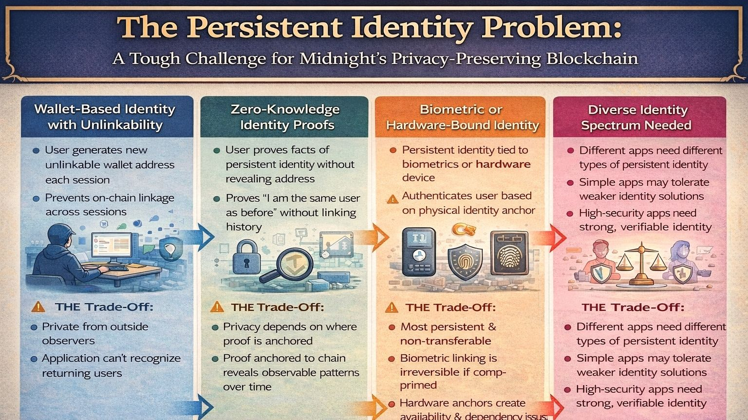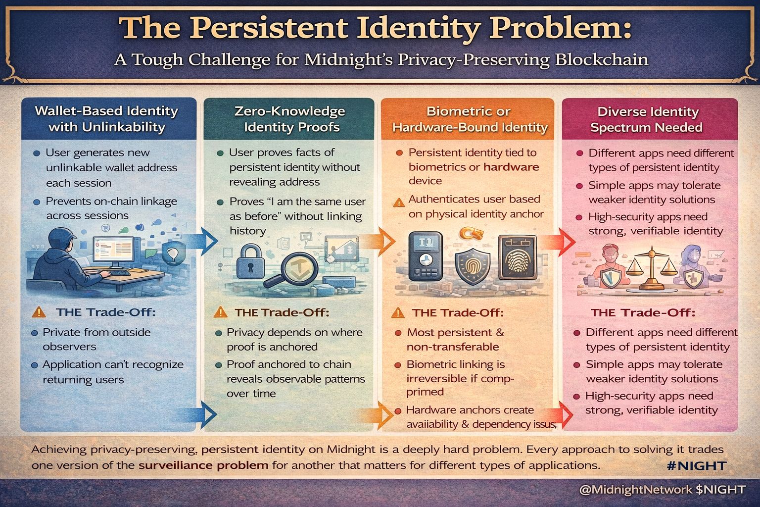 l'écosystème Midnight doit traiter l'architecture d'identité comme un problème d'infrastructure de première classe avec la même sérieux qu'il traite l'architecture cryptographique. pas comme quelque chose que chaque développeur d'application doit résoudre par lui-même. comme quelque chose qui doit être conçu soigneusement au niveau de l'écosystème avec une reconnaissance honnête des compromis impliqués dans chaque approche.
