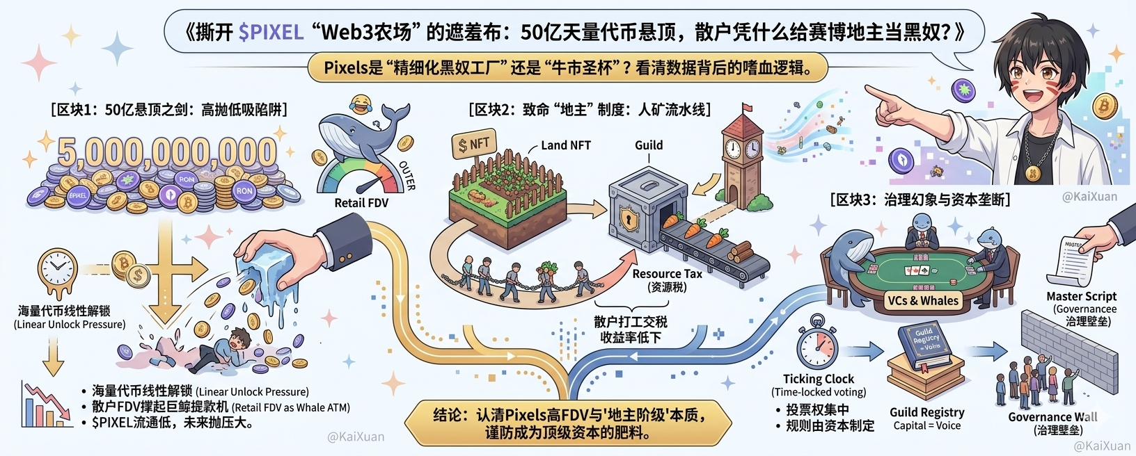 作为一个穿越过几轮牛熊、专注虚拟货币的老韭菜,我熬夜拆解了 Pixels 的白皮书、经济模型和链上数据。我得承认,相比于早期的无脑旁氏,它的经济学模型设计得确实更隐蔽,操盘手法也更懂拿捏人性。但在如今这个充斥着满屏宏大叙事的圈子里,当所有人都盯着打金暴富的幻象时,我今天必须再当一次恶人。咱们把 Pixels 所谓“用数据驱动真实玩家收益”的账本一页页撕开,看看这套“像素农场”的底层逻辑到底有多嗜血。