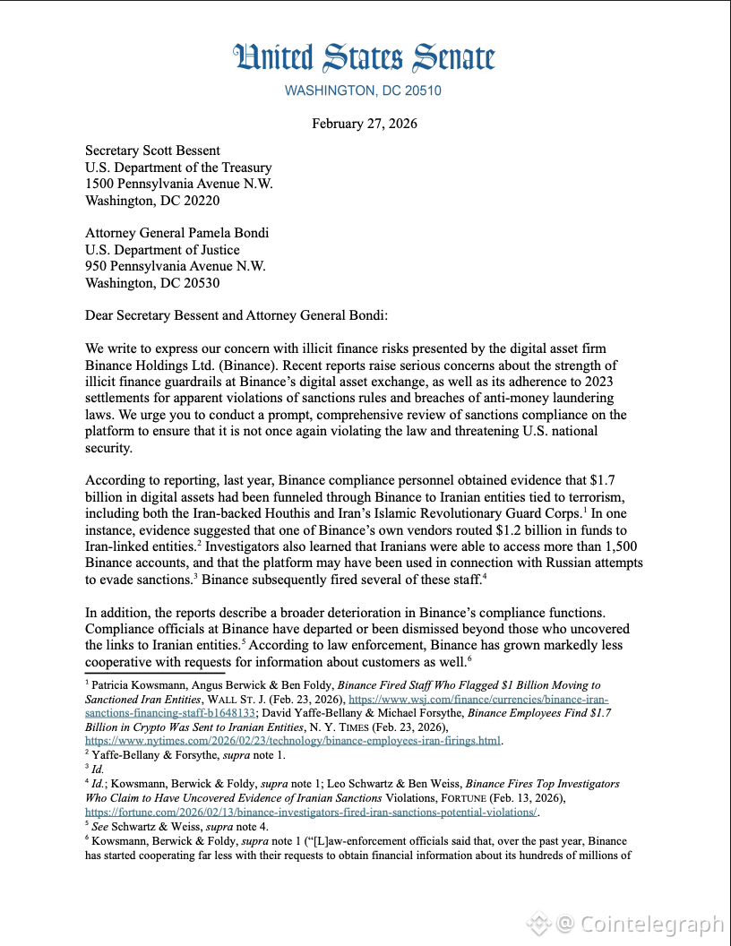 La lettre envoyée par le sénateur américain Chris Van Hollen et 10 autres législateurs en février exigeait un examen de conformité de Binance. Source : Sénateur Chris Van Hollen