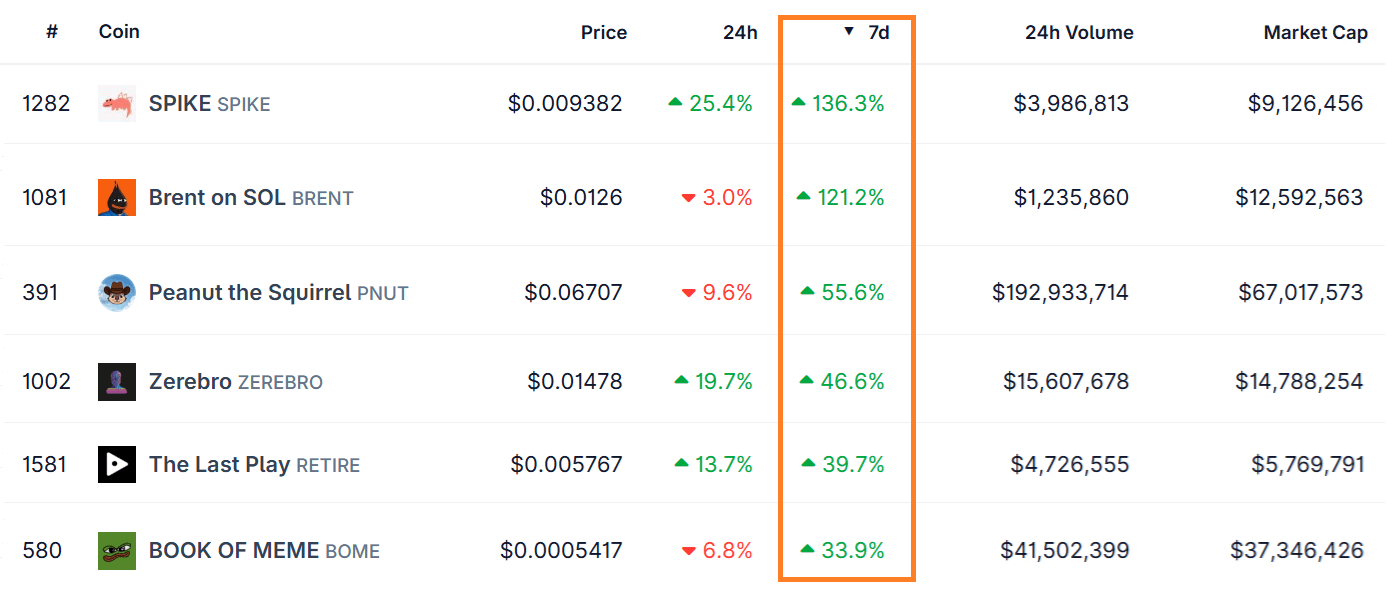 Meilleurs tokens Solana en 7 jours. Source : CoinGecko