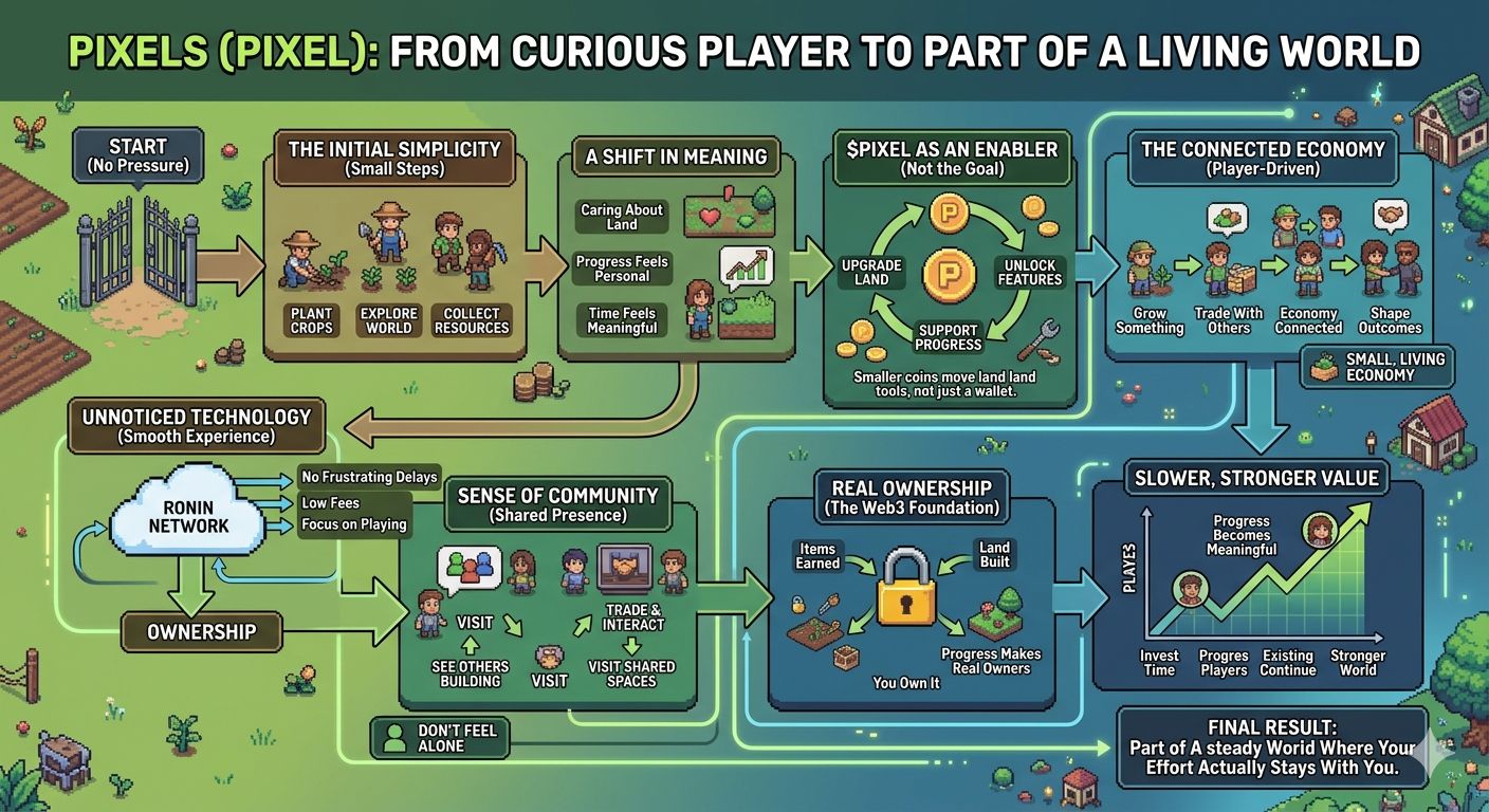 Pixels doesn’t push you to earn quickly and leave. It encourages you to stay, build, and grow over time.