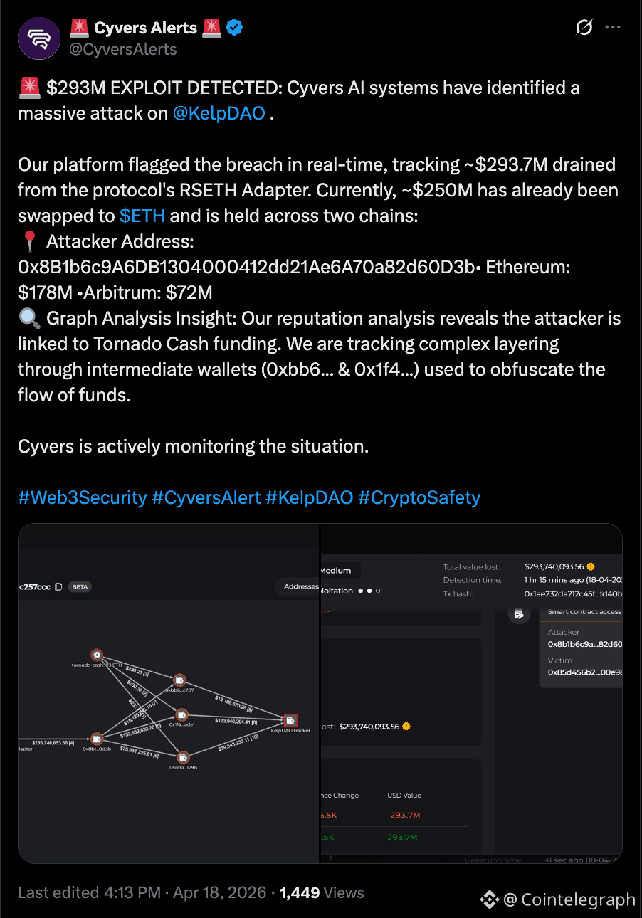 L'attaquant a exploité le contrat de pont de l'adaptateur rsETH, le code logiciel qui gère le token rsETH de Kelp, et a vidé la plateforme d'environ 293 millions de dollars en fonds, selon la société de sécurité blockchain Cyvers.
