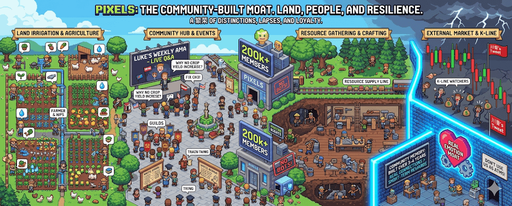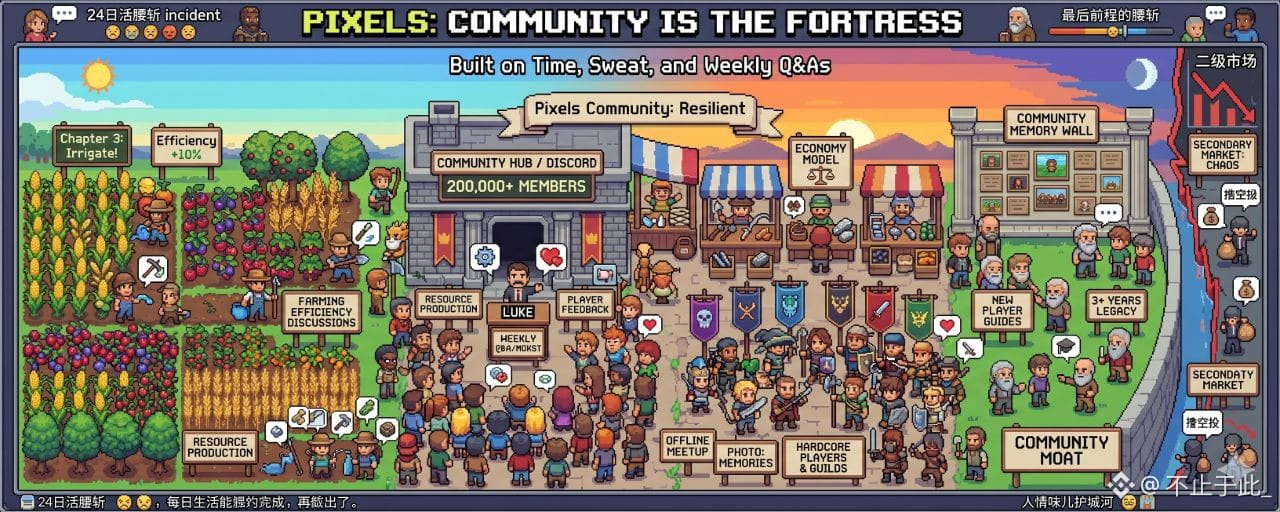 这种人情味儿是竞争对手最头疼的护城河,你可以做一个画质更吊、回本更快的农场,但你没法克隆一群在这个像素世界里混了三四年、互相认识甚至线下见过面的公会老炮儿,社区是有记忆的,那些带新人的老手和自发写攻略的硬核玩家,他们留下来不是因为那点代币收益,而是因为在这儿投入了真感情,感情这玩意儿在二级市场上买不到,也没法通过砸钱瞬间催熟