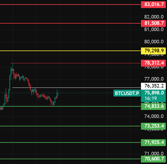 Si le niveau de 4 heures la nuit ne dépasse pas 76350, cela signifie qu'il n'y a pas de force au niveau inférieur. Le niveau de 4 heures continuera à se corriger, et descendra vers les niveaux 74830-73250-71925 pour attendre des positions longues !#BTC走势分析