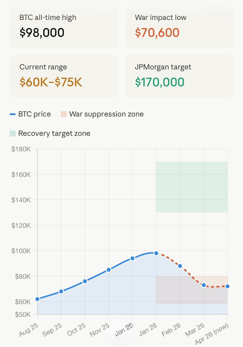 The crypto market is under renewed pressure in 2026 as war tensions involving Iran show no signs of easing, triggering energy shocks and reshuffling global monetary policy expectations — $BTC fell sharply from its previous peak of nearly $98,000 and is now fluctuating between $60K–$75K, reflecting the brutal weight of a changing macroeconomic landscape. NFT Evening The US-Iran conflict and the Strait of Hormuz blockade have sent Brent crude past $103/barrel, fueling inflation and forcing the Fed to delay rate cuts — and Bitcoin felt every bit of it, dropping to around $70,600, mirroring the oil shocks of past cycles. VALR But here's where it gets interesting: while institutional investors and algorithmic bots initially treat $BTC like a high-risk tech stock — triggering "risk-off" sell-offs in the first hours of any conflict — the secondary reaction has historically been a realization of crypto's true utility in a fragmented global economy. WEEX Every major conflict since 2020 has followed the same brutal pattern: crash, liquidation, then recovery — and once the initial shock is priced in, Bitcoin's core value proposition (decentralization, fixed supply, borderless transfers) becomes more obvious to the world, often pushing prices to new highs within months. WEEXAnalyst Nic Puckrin of Coin Bureau warns that even if the war ends today, its repercussions will dominate markets through 2026, with rate cuts unlikely before Q3–Q4 at the earliest — making BTC's current recovery "fragile." Coin-telegraph Yet the long-term structural case remains steel-strong: $BTC commands roughly 56% of total crypto market cap, and analysts at JPMorgan suggest that if BTC begins trading more consistently like gold, a $170,000 price target in 2026 is not off the table. WEEX The bottom line? War breaks markets. Bitcoin bends — but hasn't broken yet. 📊⚔️ The question isn't whether BTC survives the war cycle. History says it will. The question is: are you accumulating or watching from the sidelines?