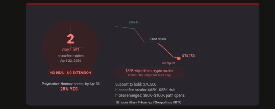 Here's the honest three-scenario breakdown for what happens after April 22.If talks somehow restart before expiry and a deal framework emerges — unlikely but possible — Bitcoin retests $78K–$80K and potentially opens a path toward $94K, its yearly open. Polymarket gives this roughly 28%.If the ceasefire simply expires without major escalation — a cold standoff — Bitcoin likely stays range-bound between $68K and $75K through most of Q2. This is the base case and the most probable outcome.If the ceasefire collapses into active conflict and oil spikes above $110–$120 per barrel, Bitcoin loses $70K support. The next meaningful floor is $65K, with $55K–$60K as a tail risk.Until the Strait reopens to full operation, the war will keep dictating Bitcoin's price action and nothing will change unless the conflict finally ends.