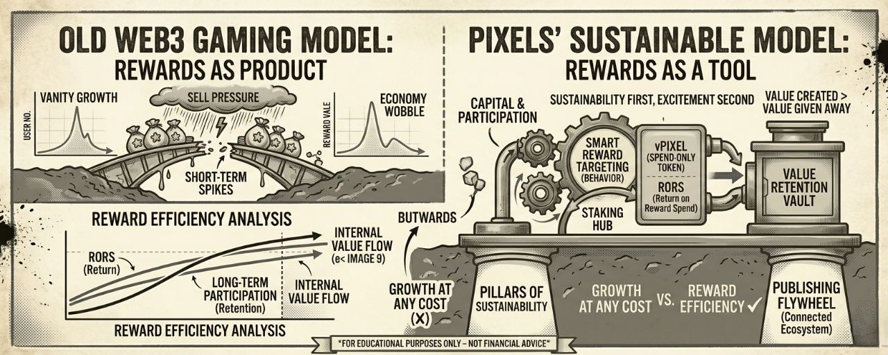 Le véritable changement est simple. Pixels essaie de s'éloigner de l'ancien modèle de jeu pour gagner qui consiste à payer plus et à espérer le meilleur. Au lieu de cela, il essaie de faire en sorte que les récompenses se comportent comme un outil. Pas tout le système. Cela compte parce qu'une économie de jeu ne survit que lorsque la valeur qu'elle crée est plus forte que la valeur qu'elle donne.