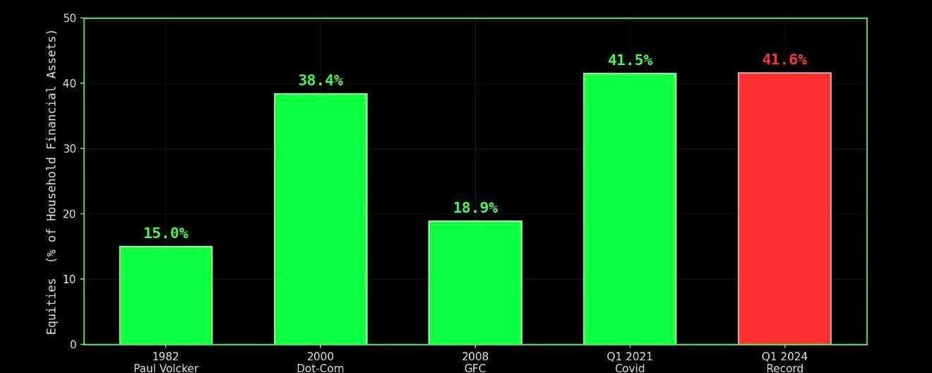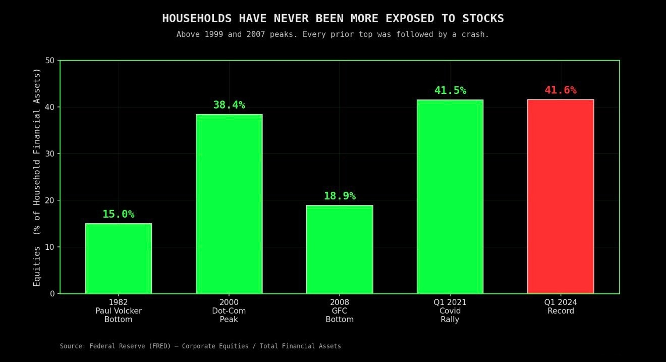 Le graphique joint montre un fait choquant : le taux de propriété des ménages en actions a atteint 41,6 %. Ce chiffre dépasse le sommet de la bulle Internet de 2000 et le sommet de la crise financière mondiale de 2008. Historiquement, lorsque tout le monde se précipite sur le marché de cette manière, nous avons atteint un point de saturation, qui est le point où il y a moins d'acheteurs nouveaux et où le risque d'effondrement commence.