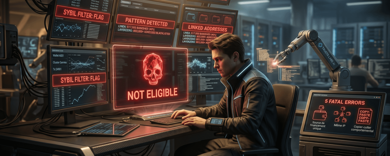 Oublie les règles simples de 2023. En 2026, des outils comme Trusta Labs utilisent l'IA pour analyser ton "humanité". Ils ne cherchent plus seulement des adresses liées, mais des comportements humains (erreurs, délais aléatoires, interactions off-chain).