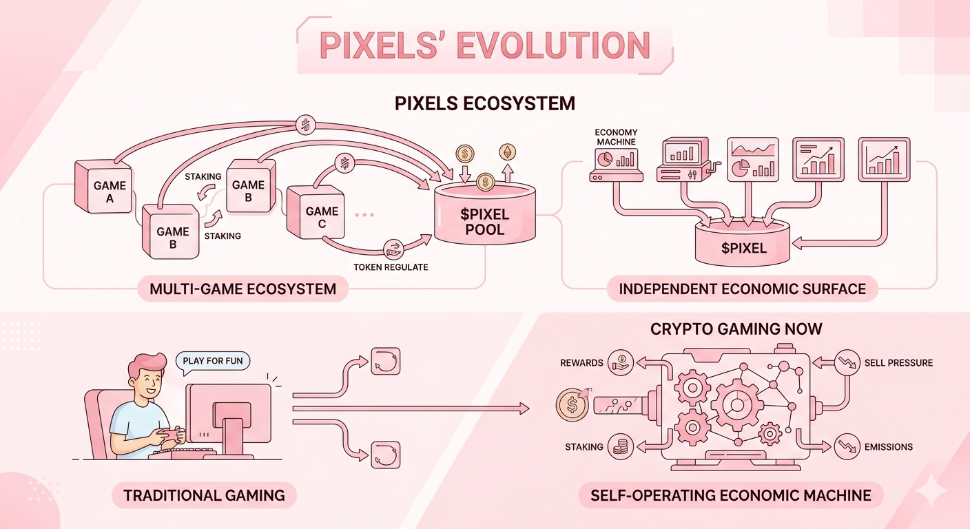 Pixels đang đi theo một hướng hơi khác. Trọng tâm nghe thì khá basic - build nhiều game trong cùng một ecosystem, dùng multi-game staking để phân phối reward và điều tiết dòng token. Nhưng cái mình thấy thú vị (và cũng hơi “ngấm” khi nhìn kỹ lại) là gần như ai cũng overlook việc mỗi game thực chất là một “economic surface” riêng, vận hành độc lập, nhưng lại cùng kéo về một pool PIXEL duy nhất.