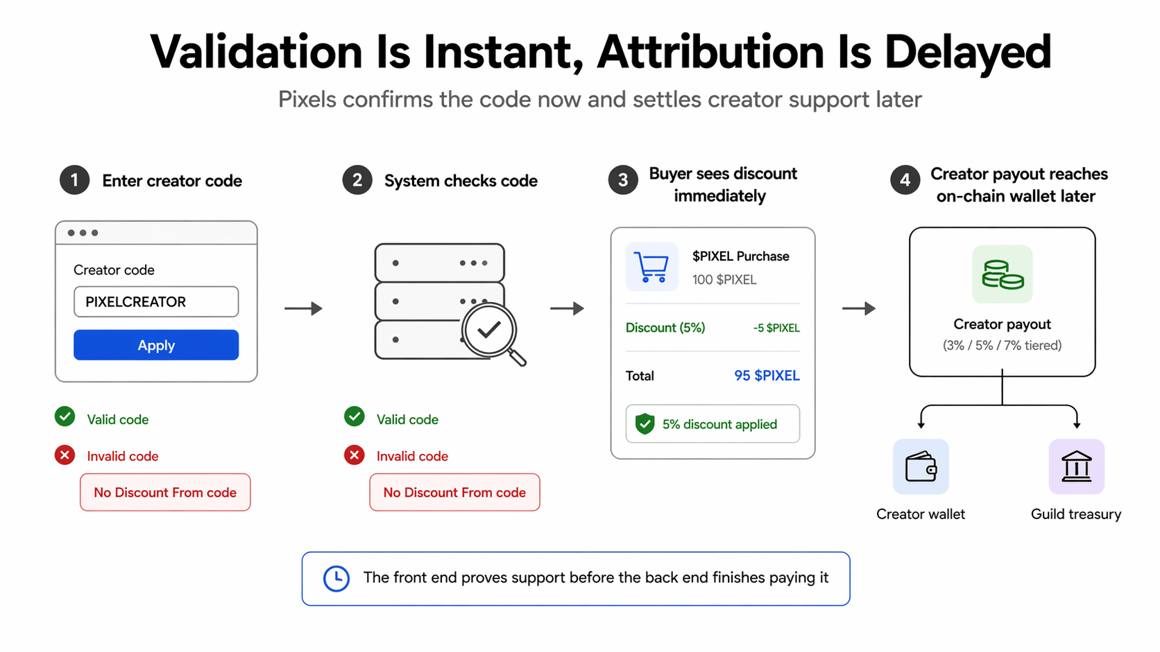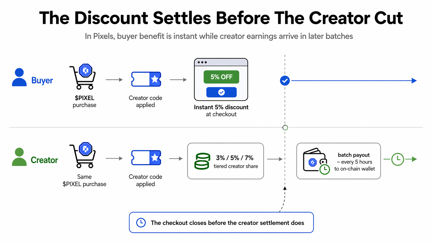 Le moment qui a changé cette mécanique pour moi n'était pas compliqué. Quelqu'un a utilisé mon code créateur. Le paiement l'a accepté. L'acheteur a immédiatement vu la réduction. De leur côté, le support était déjà visible et terminé. Le prix réduit était juste là à l'écran. L'achat avait été effectué. Le $PIXEL s'était déjà déplacé.