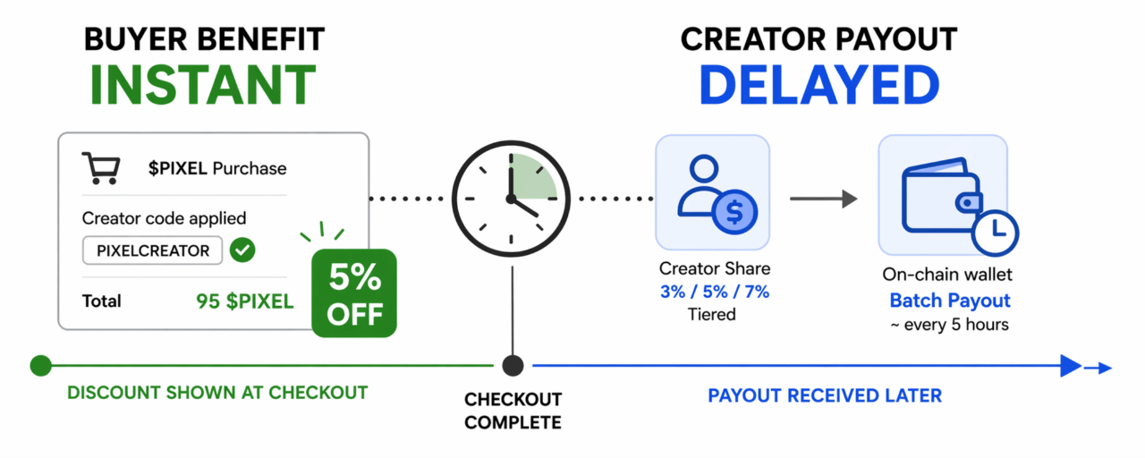 C'est la répartition exacte qui est restée avec moi. L'acheteur n'a pas à deviner si le code a fonctionné. La réponse apparaît au moment du paiement. Si le code s'applique, la réduction s'affiche immédiatement. Si ce n'est pas le cas, cet échec est également visible tout de suite. Le système donne à l'acheteur une réponse claire au moment de la dépense. Mais ma part de créateur ne se ferme pas à l'intérieur de ce même moment. Elle est envoyée plus tard en lot au portefeuille, environ toutes les 5 heures. Ainsi, le paiement peut déjà prouver que mon code a fonctionné pour l'acheteur tandis que de mon côté, c'est encore non résolu.