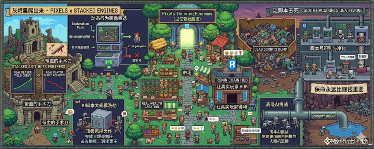 我最近一直猫在Ronin链上观察Pixels的活法,现在的Pixels已经不是单纯的游戏,它背后那套从死人堆里爬出来的Stacked引擎才是核心,这玩意儿不跟你谈什么改变世界,它就像一把带血的手术刀,专门切掉那些躲在指纹浏览器后面的脚本刷子,昨天我拉了一下最新的生态数据,发现接入这套逻辑的项目,真实活跃玩家的收益曲线跟脚本号已经完全脱钩,他基于动态行为画像的筛选,比那些生硬的验证码高明了不知道多少个维度