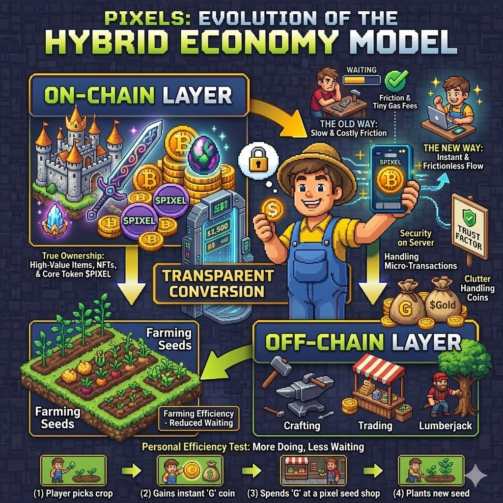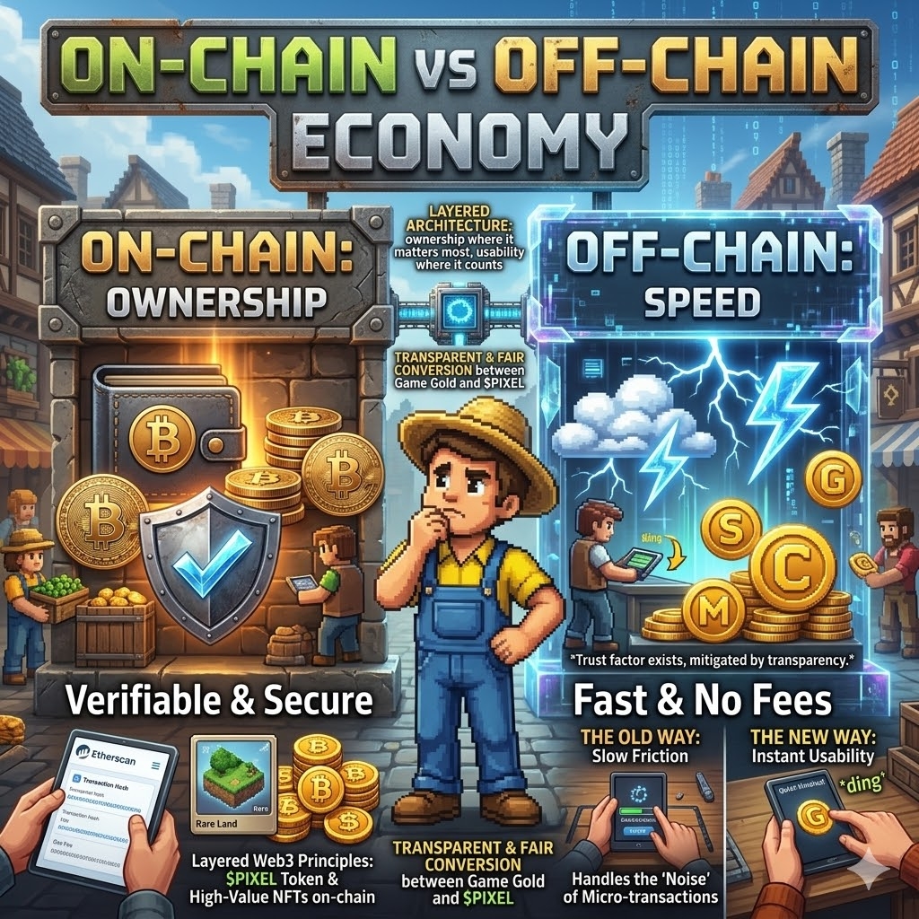 When @Pixels introduced off-chain coins, I’ll be honest, I hesitated. It sounded like a step away from what makes Web3 gaming valuable in the first place—true ownership. I’ve always leaned toward keeping assets on-chain, so the idea of part of the economy living on a server didn’t sit right with me at first.