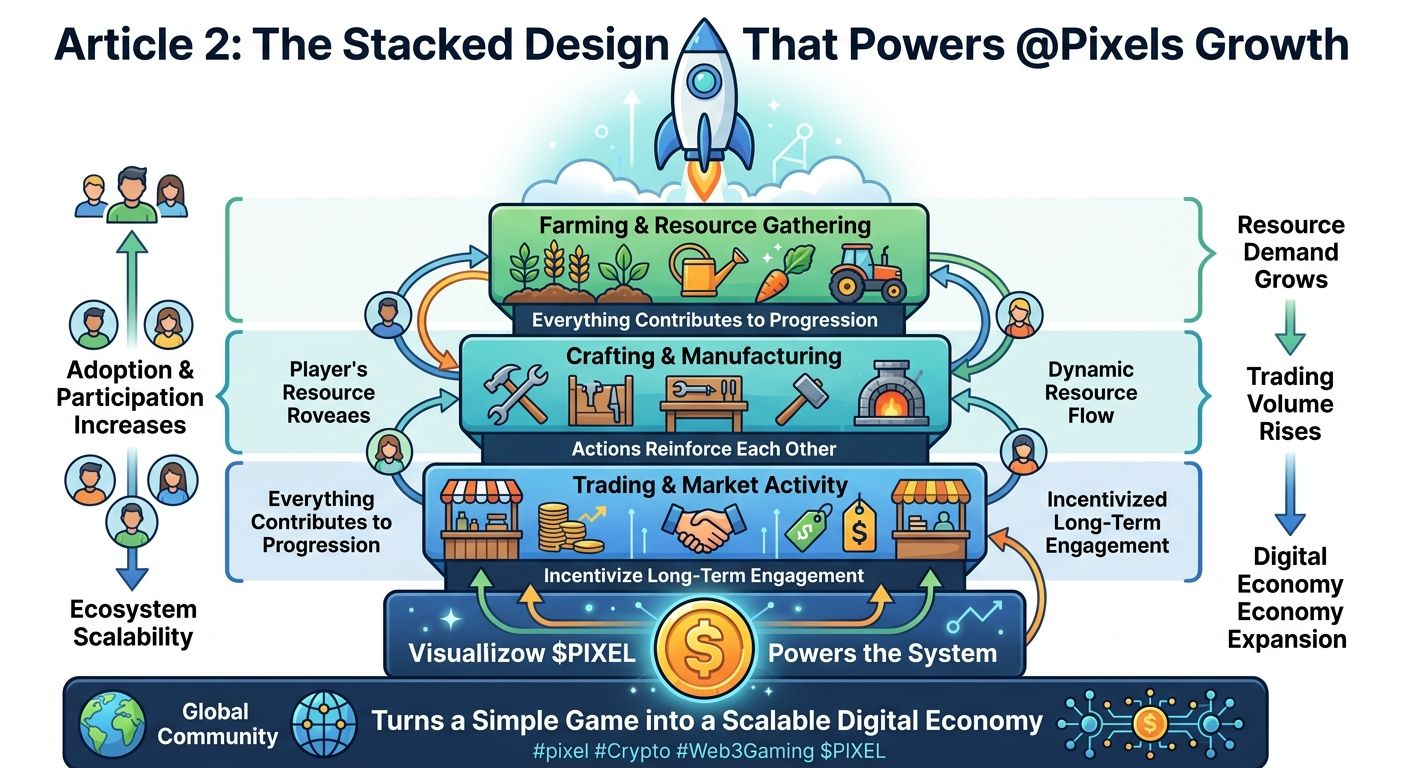 The core strength of @Pixels lies in its Stacked ecosystem, where each layer of gameplay reinforces another. Powered by $PIXEL , the system ensures that no action is wasted—everything contributes to progression and value creation.
