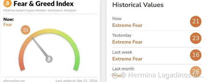 Today’s Crypto Fear & Greed Index is telling a dangerous, contradictory story that every trader must understand. The gauge reads “Now: Fear at 33”, but the historical panel on the right says “Now: Extreme Fear 21”. Two different readings, one brutal conclusion: crypto sentiment is broken and deeply bearish, even as institutions pour billions into Bitcoin.