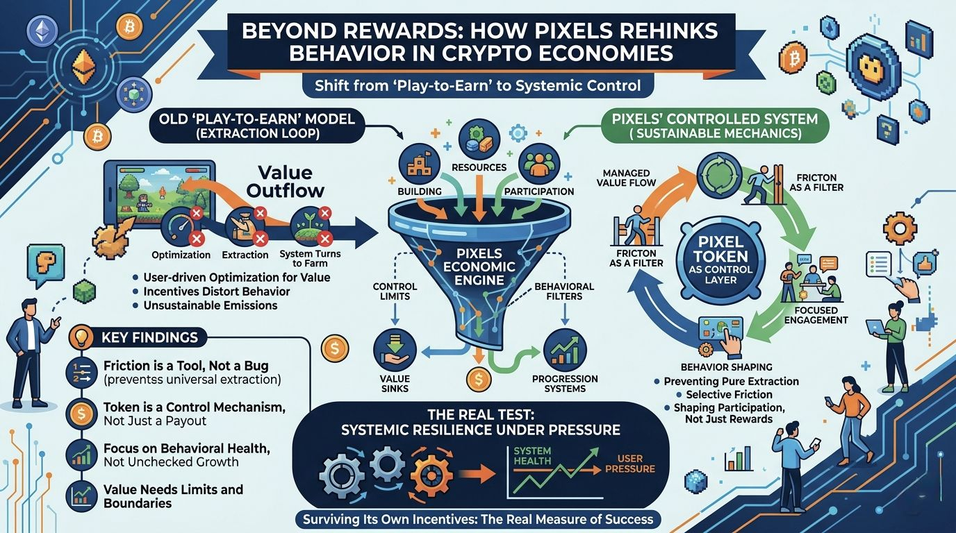 There is a point in every crypto cycle where I stop listening to what a project says and start watching what it actually does under pressure. Most systems look clean when they are growing, but they only reveal their real design when users begin to optimize, extract, and push against the edges. That is exactly where Pixels started to make more sense to me.