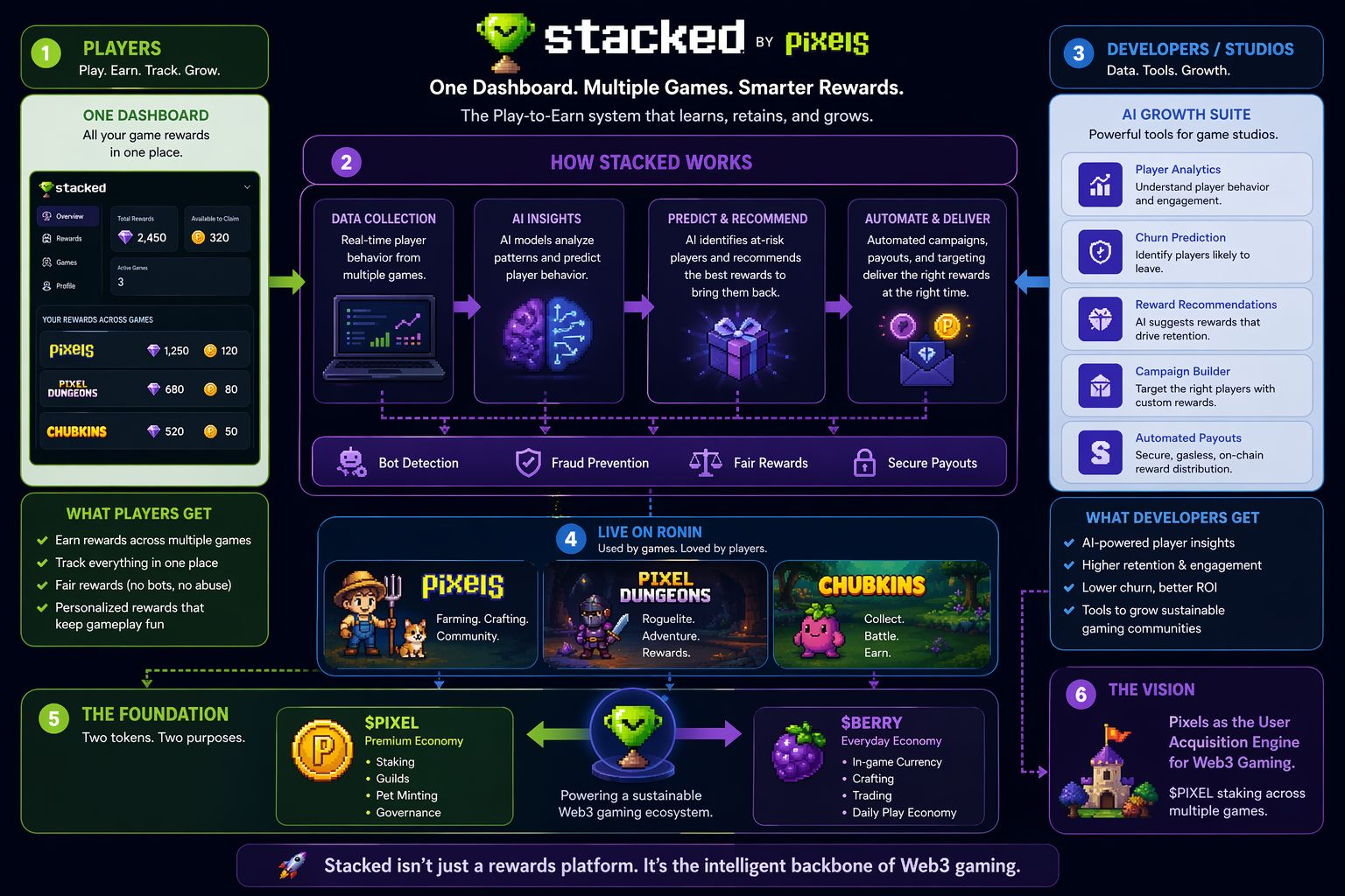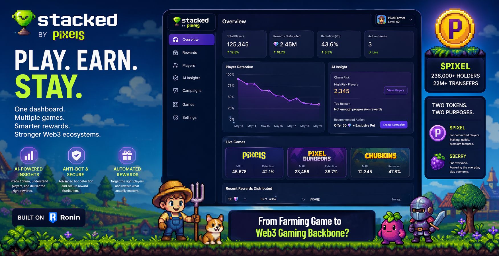 the player side is clean. earn stuff, track it, done. but the developer side is what got me. stacked gives game studios an ai tool that watches how players act, flags who's about to quit, and tells the studio what kind of rewards would bring them back. read that again. a farming game team built a data product for other game developers. not some big funded infrastructure company. the pixels team. the same people who started with crops and pet minting and cozy pixel art. and it's not a demo. it's running live in pixels, pixel dungeons, and chubkins right now. three games. real players. real data.