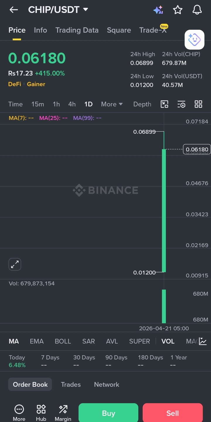 CHIP/USDT launched from a 24h low of $0.01200 all the way to a peak of $0.06899 — settling at its current price of $0.06180, representing a staggering +415% gain in a single trading session. To put that in rupee terms, that's a move from roughly Rs3.35 to Rs17.23 in one day.