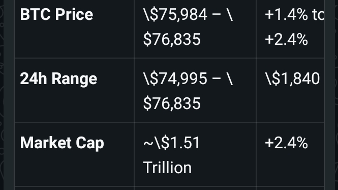 **BTC Price** $75,984 – $76,835 +1.4% to +2.4%