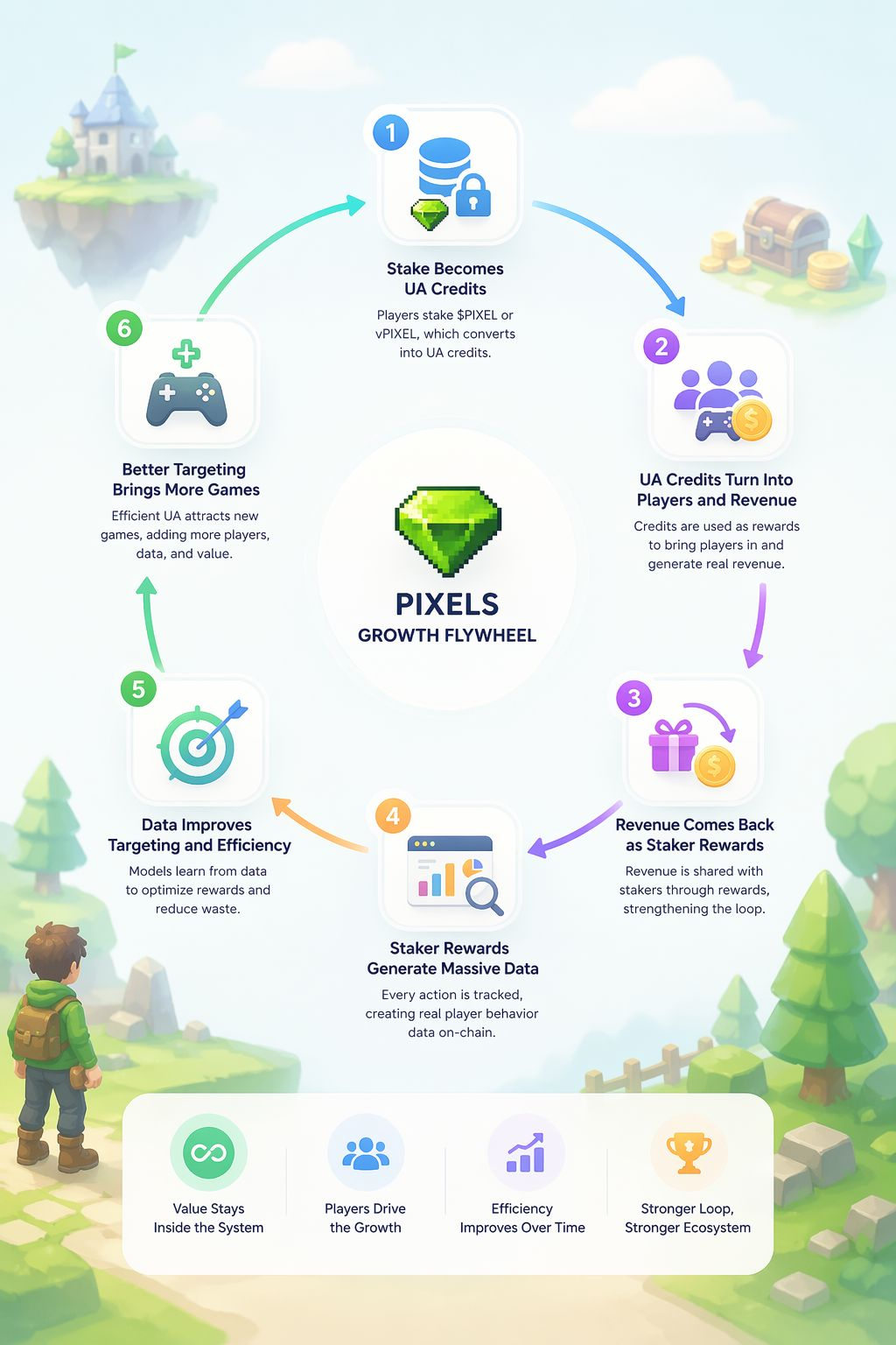 Le même $PIXEL passe par plusieurs étapes. Il est mis en staking, puis devient des crédits UA, puis se transforme en récompenses pour les joueurs, puis devient des revenus, et enfin retourne sous forme de récompenses de staking. En cours de route, il devient également des données qui améliorent le prochain cycle.