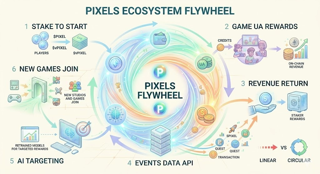Ce que Pixels construit ressemble davantage à un moteur de croissance en boucle fermée où le capital, les utilisateurs, et les données tournent continuellement au lieu de quitter le système.