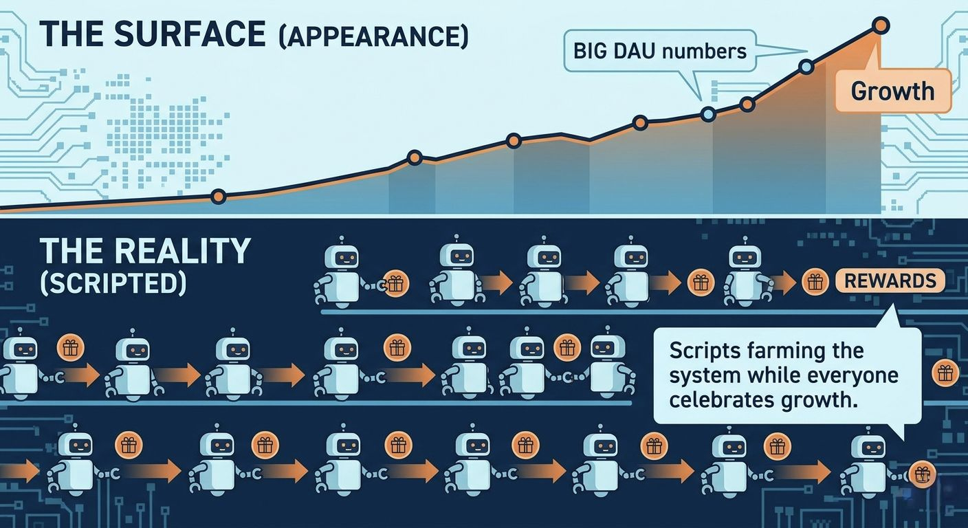 I’ve been around long enough to stop getting impressed by big DAU numbers. You see a chart go vertical, Twitter starts screaming “mass adoption,” and I’m just sitting there thinking… yeah, show me the wallets. Show me the behavior. Show me actual humans.