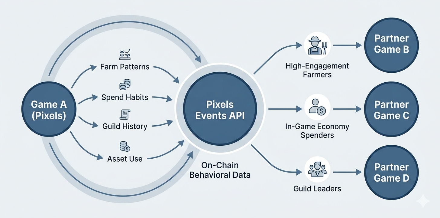 Pixels construit actuellement une infrastructure qui vise à réduire structurellement cette friction pour ses développeurs partenaires : l'API Pixels Events. Ce système va au-delà des simples métriques de détention de tokens basées sur les wallets pour exposer des données comportementales on-chain granulaires aux jeux partenaires. Un développeur intégrant l'écosystème Pixels n'accède pas seulement à une base d'utilisateurs ; il hérite d'un profil comportemental complet pour chaque joueur connecté. Ce profil inclut des patterns spécifiques et vérifiables : fréquences de farming, habitudes de dépense de ressources, utilisation d'actifs en jeu et métriques d'engagement historique des guildes. Un jeu partenaire peut donc utiliser ces données portables dès le premier jour pour adapter les expériences initiales, cibler des programmes d'incitation et identifier les utilisateurs les plus susceptibles de rester et de monétiser, le tout basé sur un comportement historique documenté plutôt que sur des projections spéculatives.