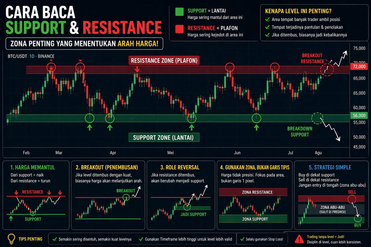 Role Reversal: Kalau plafon (Resistance) jebol, dia bakal berubah fungsi jadi lantai baru (Support). Begitu juga sebaliknya. Ini yang disebut Breakout.