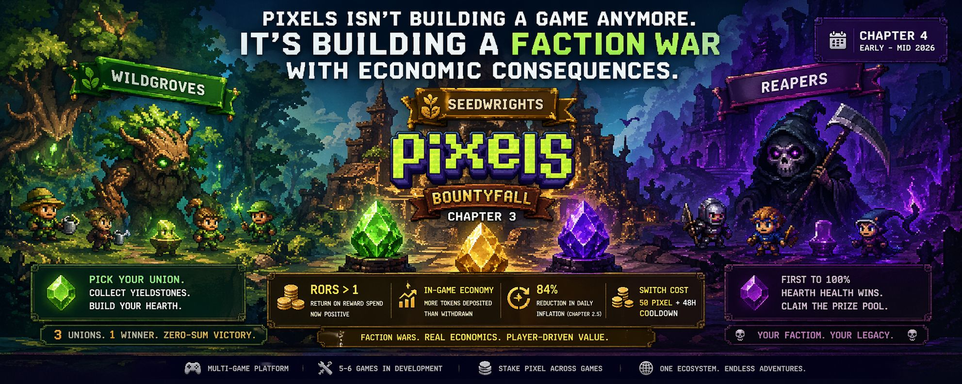 I almost missed what Chapter 3 actually changed. From the outside it looked like a content drop. New lore, three unions, some competitive flavor added on top of the usual farming loop. The kind of update you see in live-service games every quarter. But after going deeper into how Yieldstones actually work inside Bountyfall, I started thinking about it differently. This isn't really a content update. It's an architecture shift.
