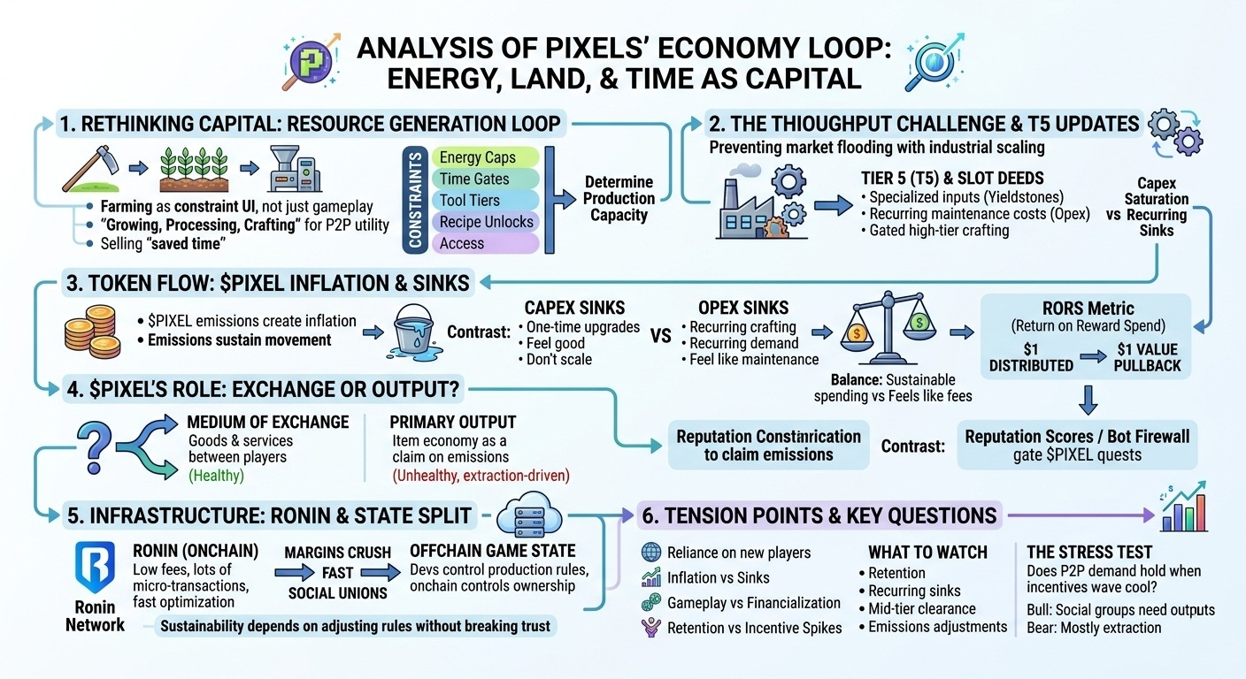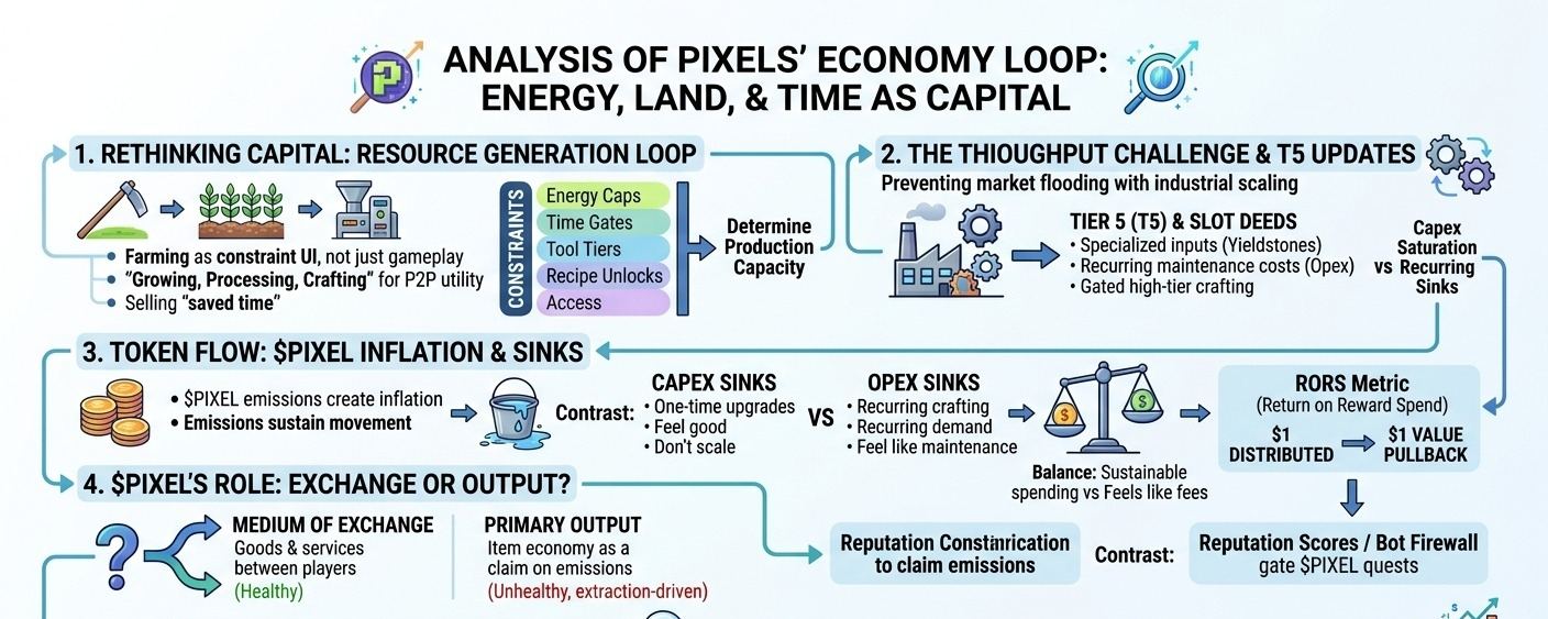 token flow: $pixels is the part i’m still suspicious about, mostly because emissions are easy and sinks are hard. emissions keep people moving, and they also smooth out the “my crafted goods aren’t selling today” frustration. but emissions create inflation pressure by default, so the real question is whether sinks behave like opex (ongoing, repeatable) or capex (one-time upgrades that saturate). if sinks are mostly capex—pay for an upgrade, pay for access once, buy a thing and you’re done—then they don’t scale with the long-term emission stream. and here’s the part i’m thinking about: a lot of web3 games accidentally build capex-heavy sinks because they feel good (permanent progress), but then they’re shocked when sell pressure returns after everyone is “upgraded.”