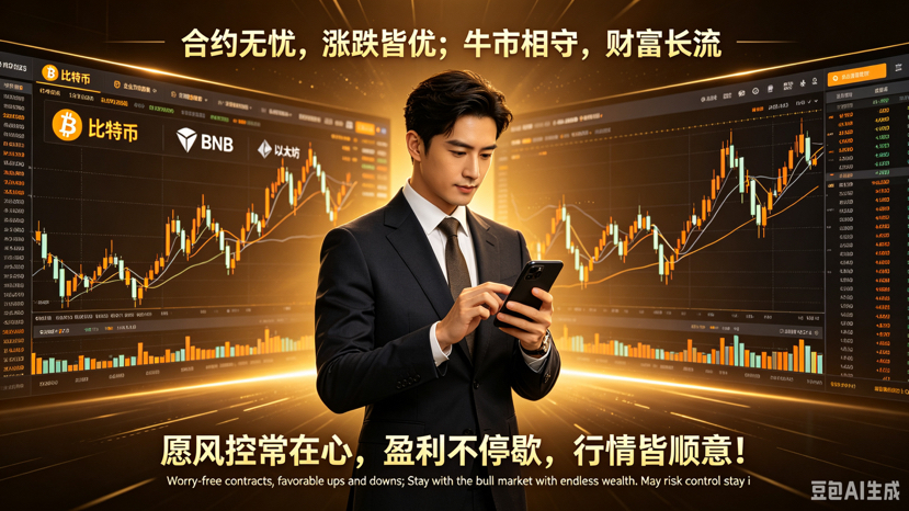 中文:合约无忧,涨跌皆优;牛市相守,财富长流。愿风控常在心,盈利不停歇,行情皆顺意!$BTC