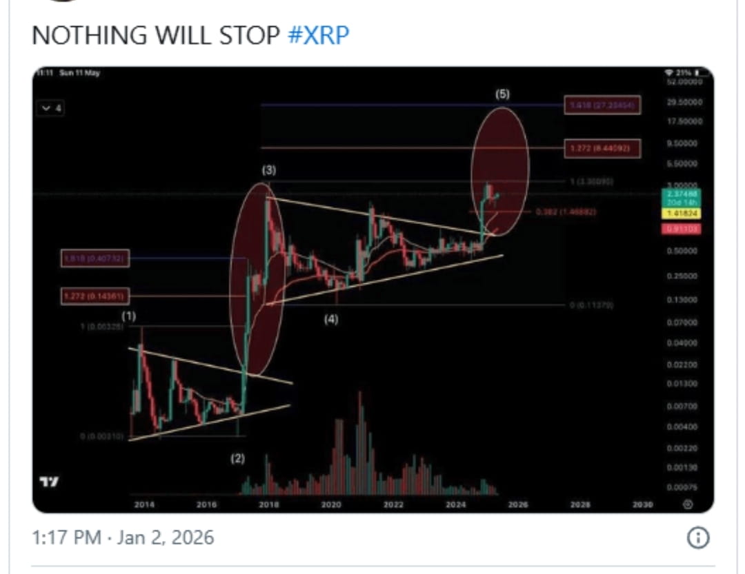 Le graphique place l'évolution actuelle du prix dans un schéma qui s'est produit à plusieurs reprises. Chaque cycle précédent a suivi une progression similaire. XRP s'est déplacé latéralement à l'intérieur de triangles symétriques avant des hausses rapides. Après ces hausses, XRP est entré dans une phase de correction qui s'est maintenue au-dessus du soutien de tendance clé. La dernière structure montre le même comportement.