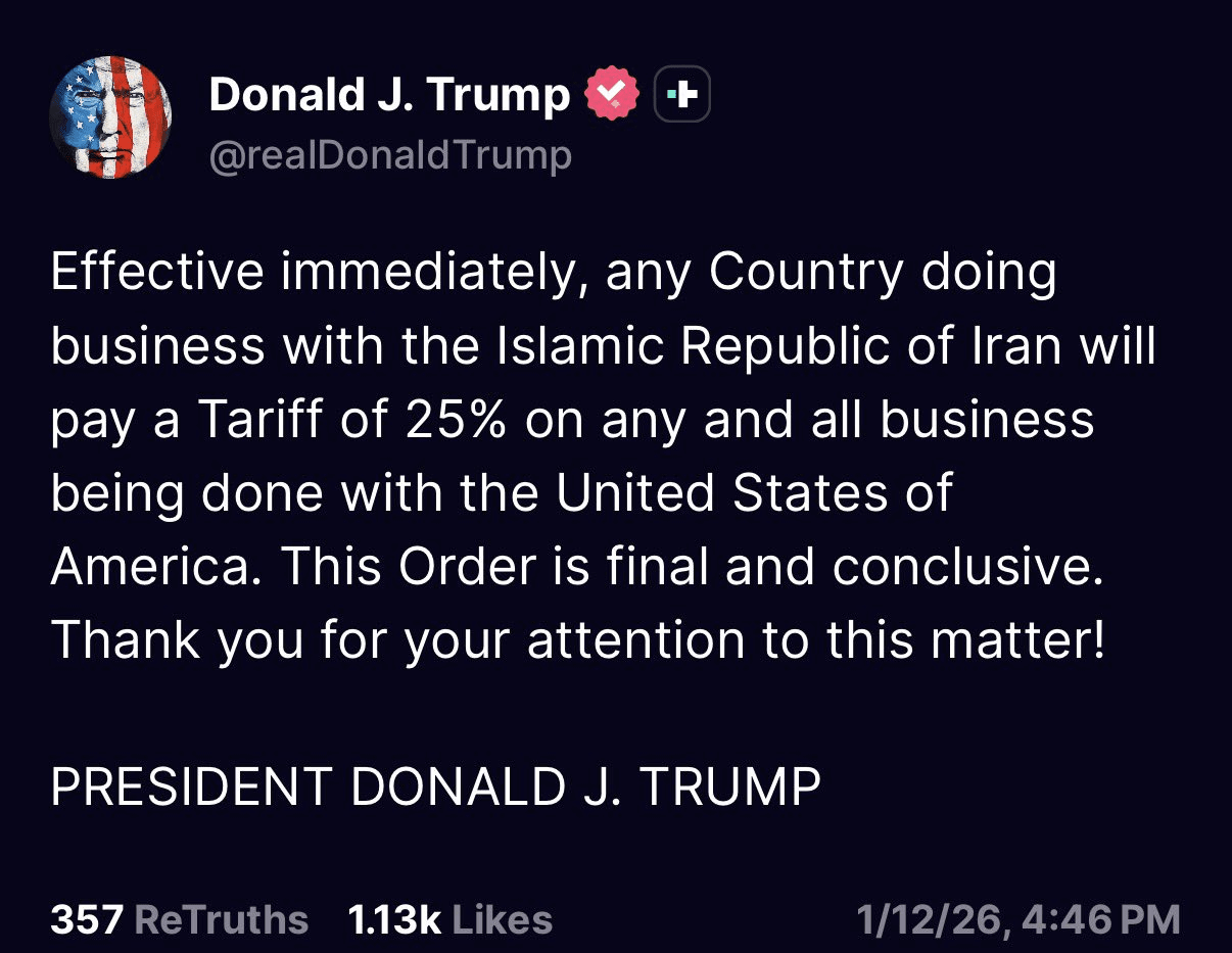 INFO : Le président Trump impose un tarif de 25 % sur tout pays faisant affaire avec l'Iran.