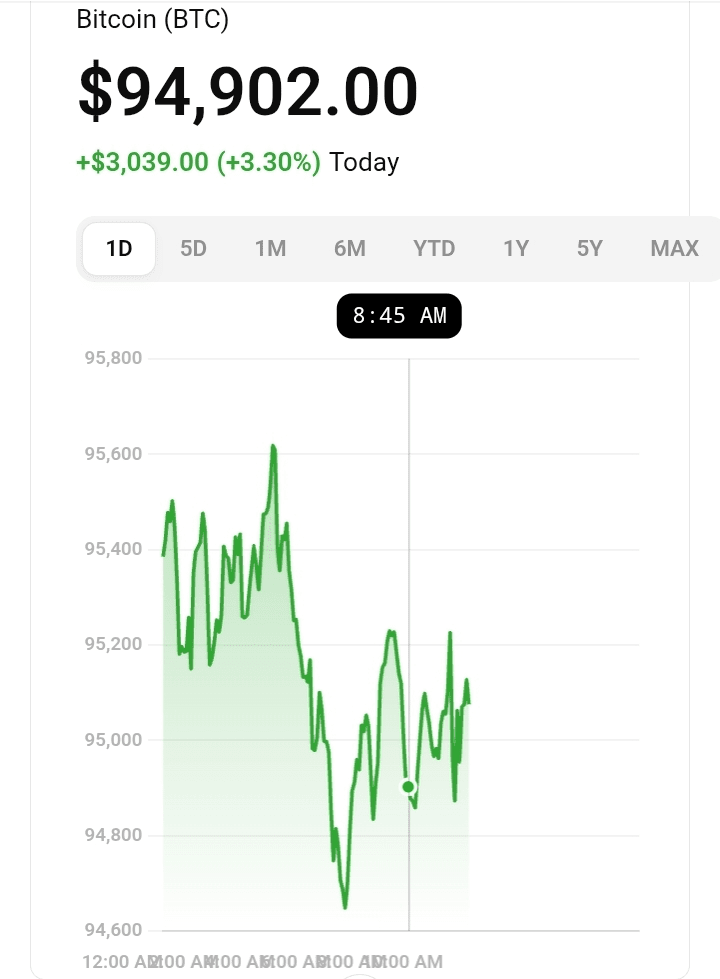 Prix du BTC : ~95 000 $ (environ le prix actuel en direct).