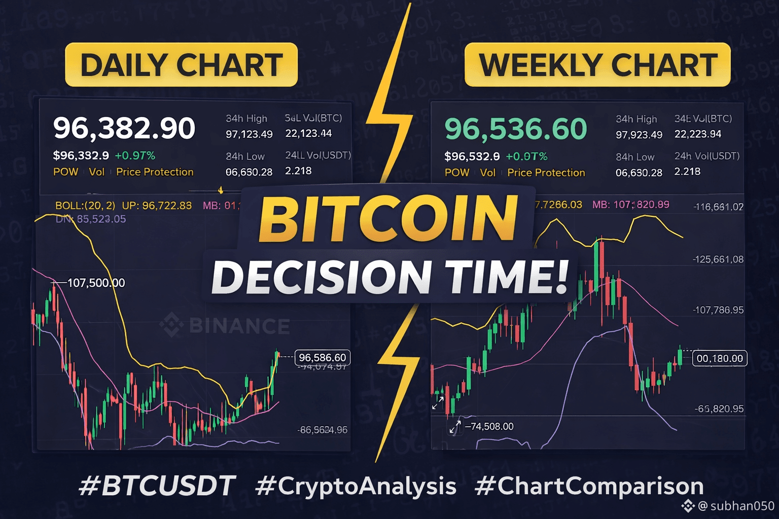 Bitcoin (BTC/USDT) is currently trading near the 96,000 USDT level, and the market is sending mixed but important signals. To avoid confusion and emotional trading, it is necessary to analyze both the weekly and daily charts, because each timeframe shows a different side of the market.