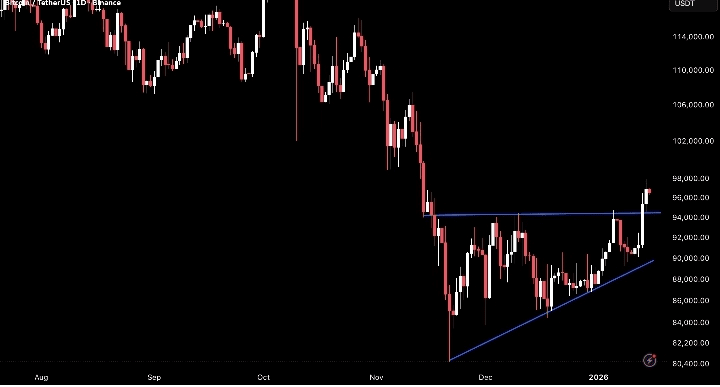 âChangement de situation : Ce qui Ă©tait autrefois un plafond (94 000 $) est dĂ©sormais le nouveau plancher (support). Tant que le Bitcoin reste au-dessus de ce niveau, la tendance reste fortement haussiĂšre.