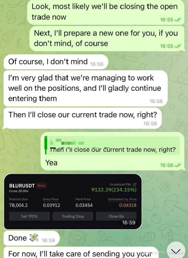 In the conversation shown, there is no emotional back-and-forth. One side suggests closing the trade. The other confirms. The trade is closed. Done.