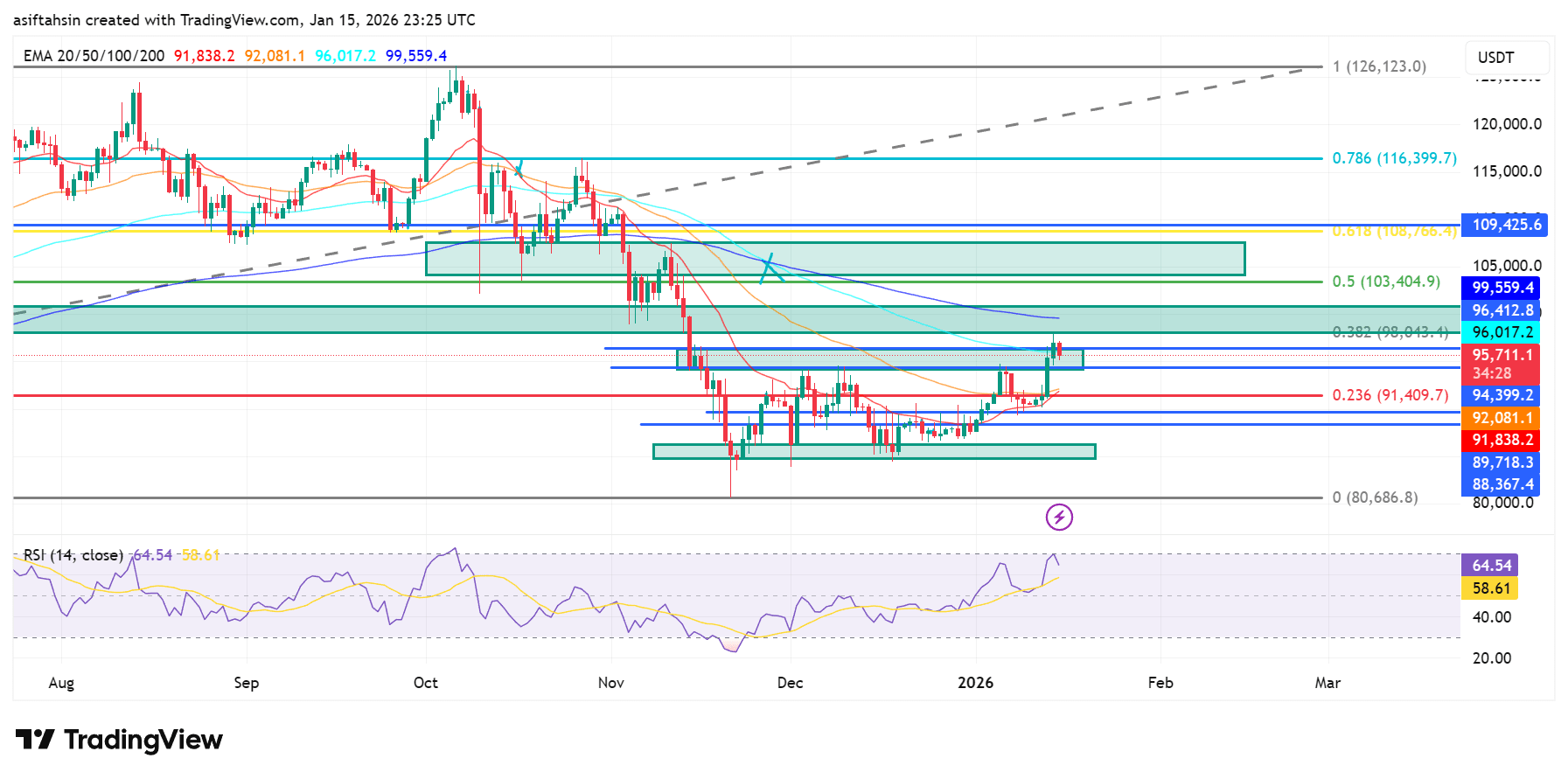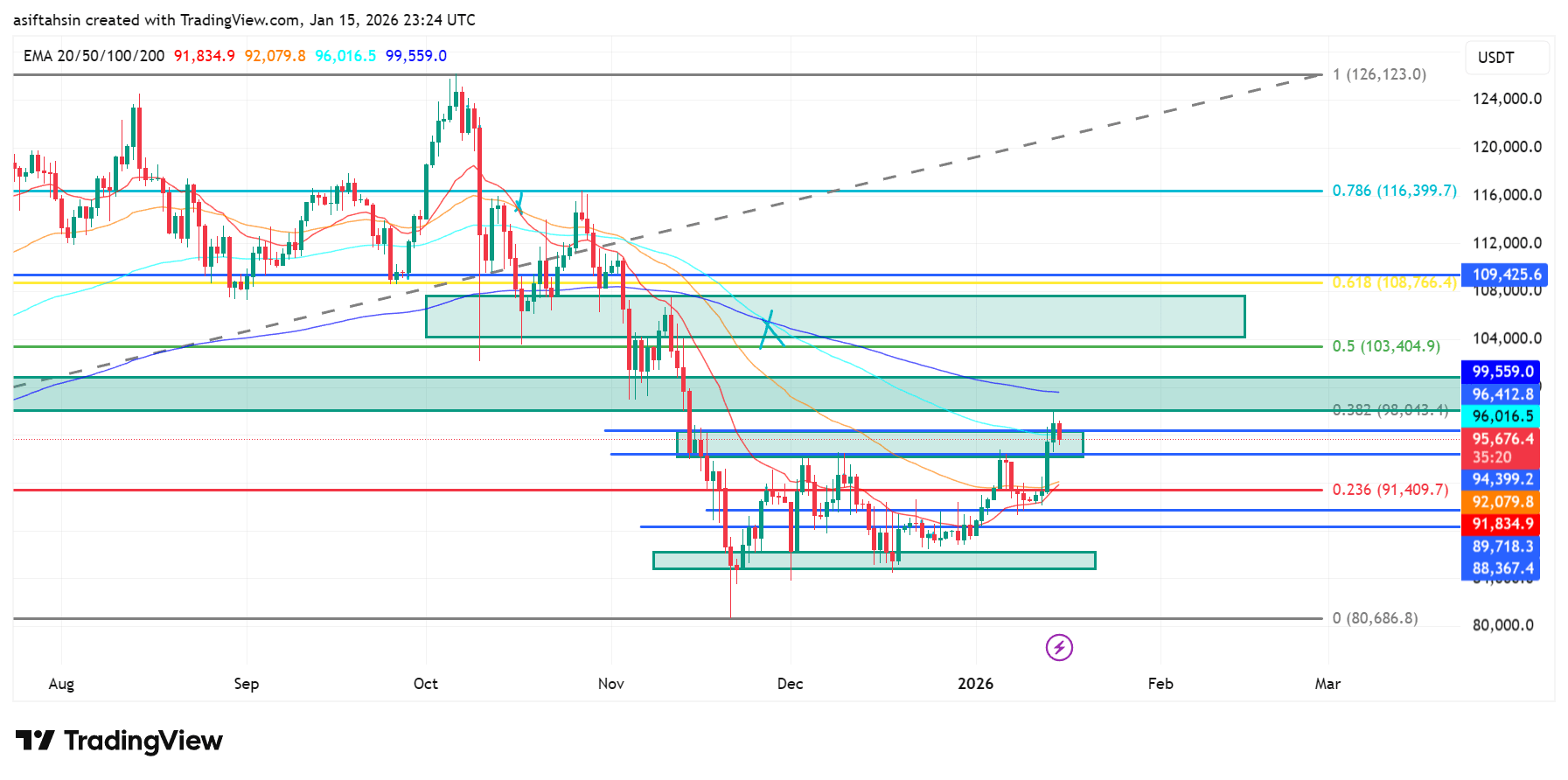 La zone $96K–$100K représente un cluster de résistance dynamique majeur, où la pression de vente est susceptible d'augmenter.