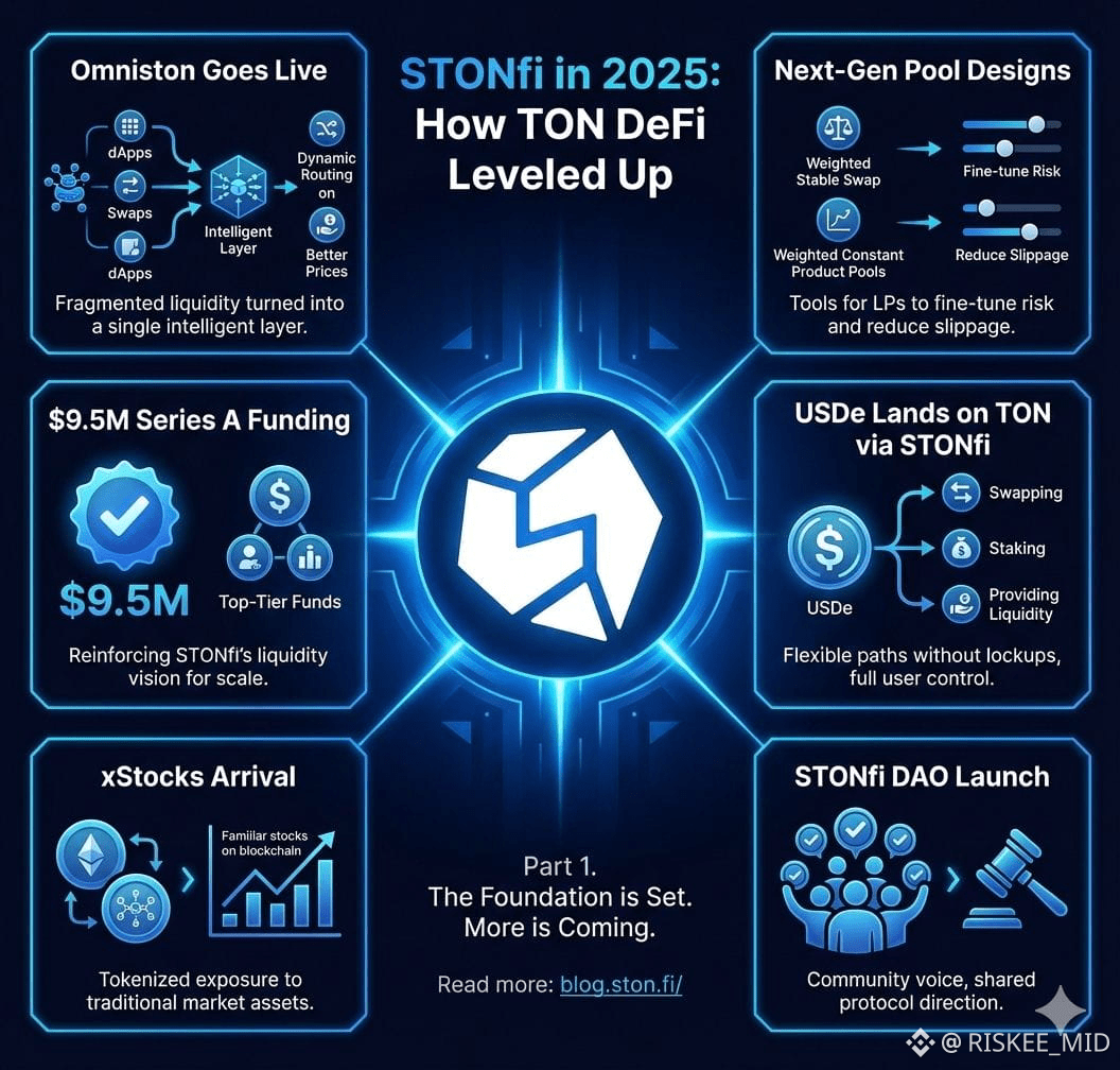 2025 was the year TON’s DeFi stopped being an experiment and started behaving like an actual financial stack. At the center of that shift was STON.fi — not just a bigger DEX, but a toolkit for making liquidity work smarter, faster, and with more options for users and builders. Below I break down the main building blocks STON.fi rolled out last year, why they matter, and what they mean for traders, liquidity providers, and the broader TON ecosystem.