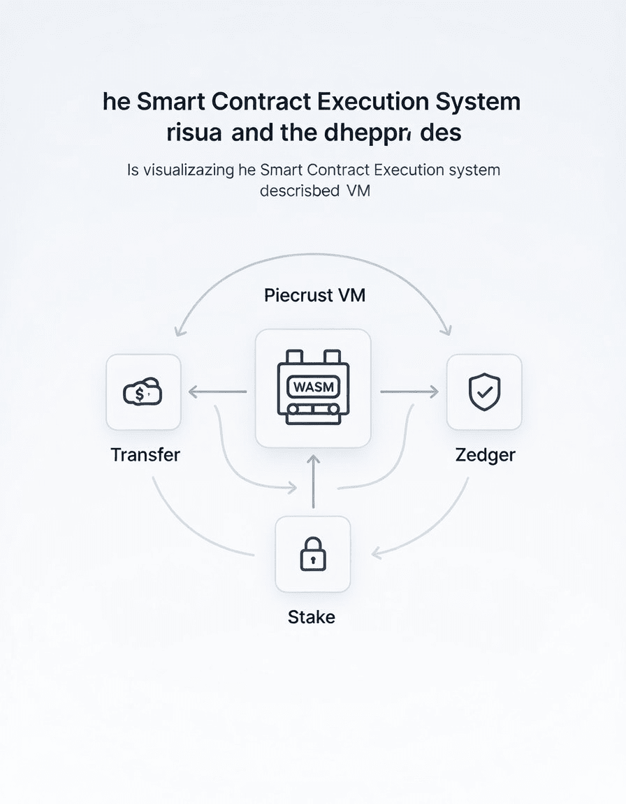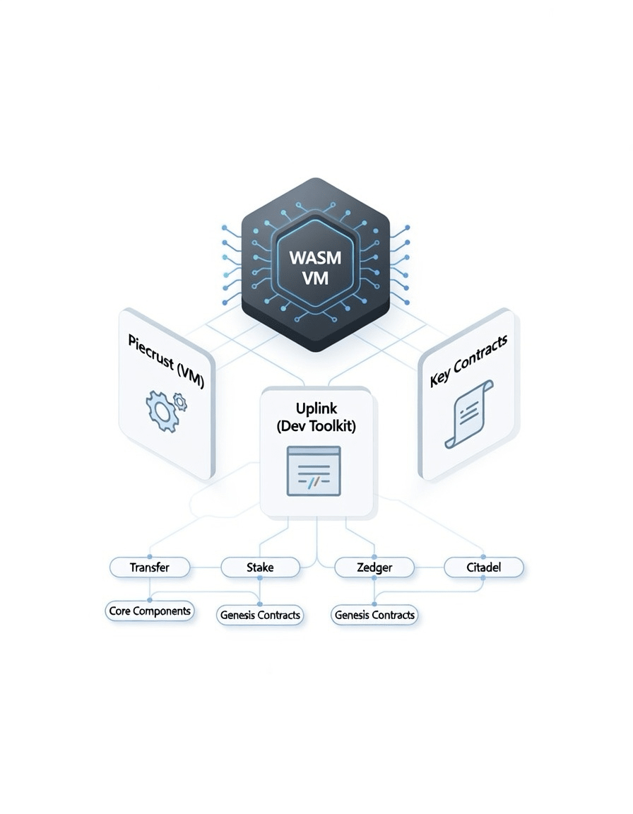 Piecrust VM executes compact WASM contracts securely/modularly. Core: piecrust (VM), uplink (dev toolkit). Rust-based, focuses portability/security/performance. Modular for extensions. Handles crypto securely.