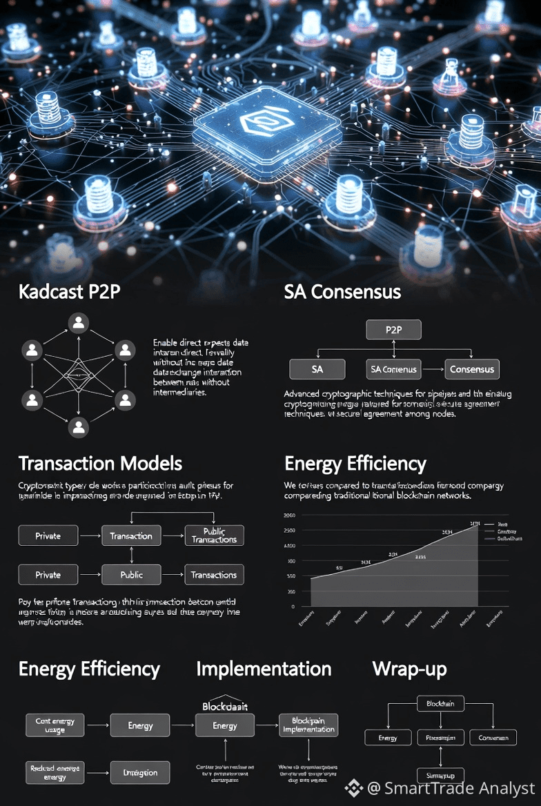 Network: Kadcast structured, XOR-based reduces bandwidth 25-50% vs gossip/LibP2P, lowering node energy/data center load. 10-30% fewer stales saves validation power.