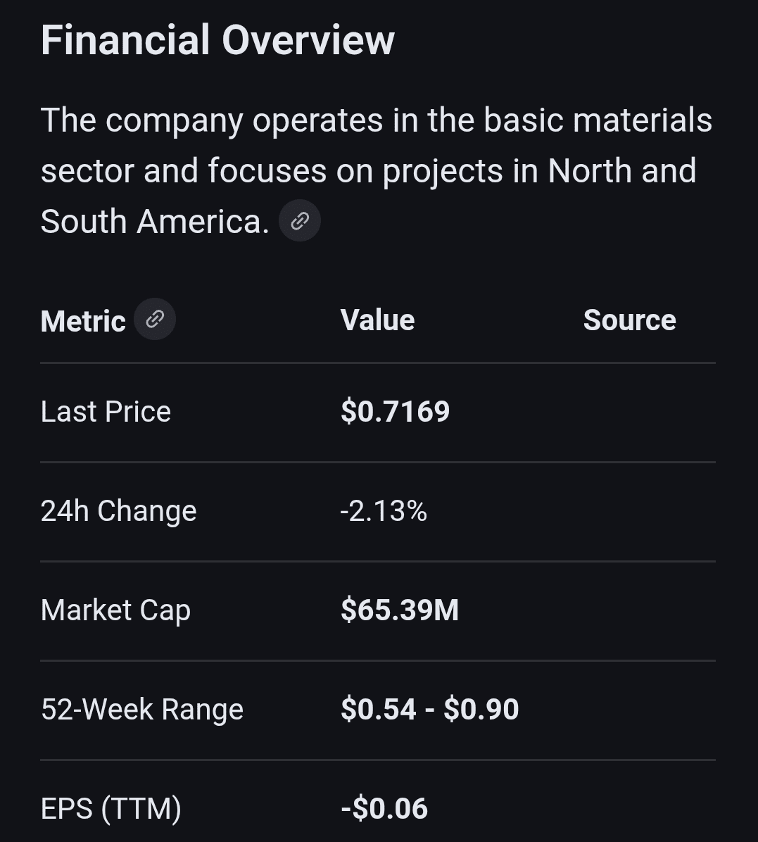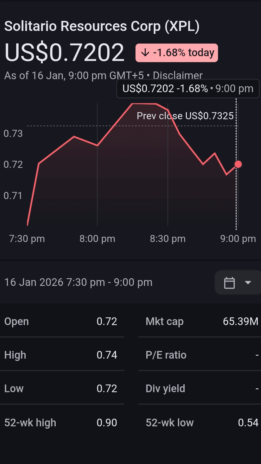 L'action de Solitario Resources Corp (XPL), une société d'exploration de métaux précieux et de base, se négocie à environ 0,72 $ USD au 16 janvier 2026.