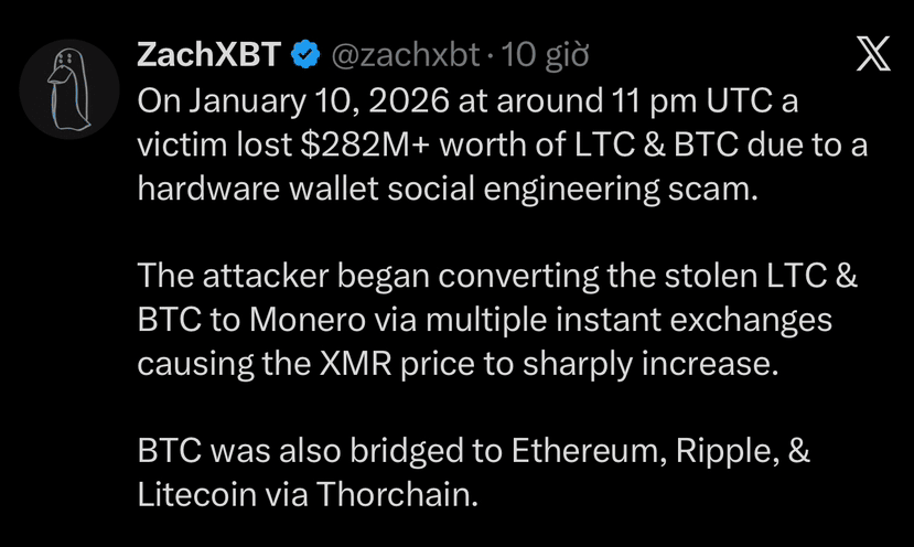 Selon l'enquêteur sur la chaîne @ZachXBT , une victime a perdu plus de 282 millions de dollars en $BTC et $LTC après être tombée dans une attaque d'ingénierie sociale sophistiquée ciblant leur portefeuille matériel. L'attaquant a obtenu un accès à distance, a vidé les fonds, puis a immédiatement blanchi des portions en échangeant $LTC/$BTC contre $XMR (provoquant une forte hausse des prix) et en acheminant 818 BTC (~$78M) à travers THORChain dans 19,631 ETH, 3.15M XRP et 77,285 LTC.