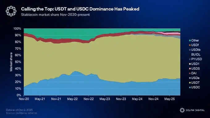 Situation actuelle : les stablecoins en dollars représentent 99,7 % du total, mais pourraient avoir atteint un pic de domination.