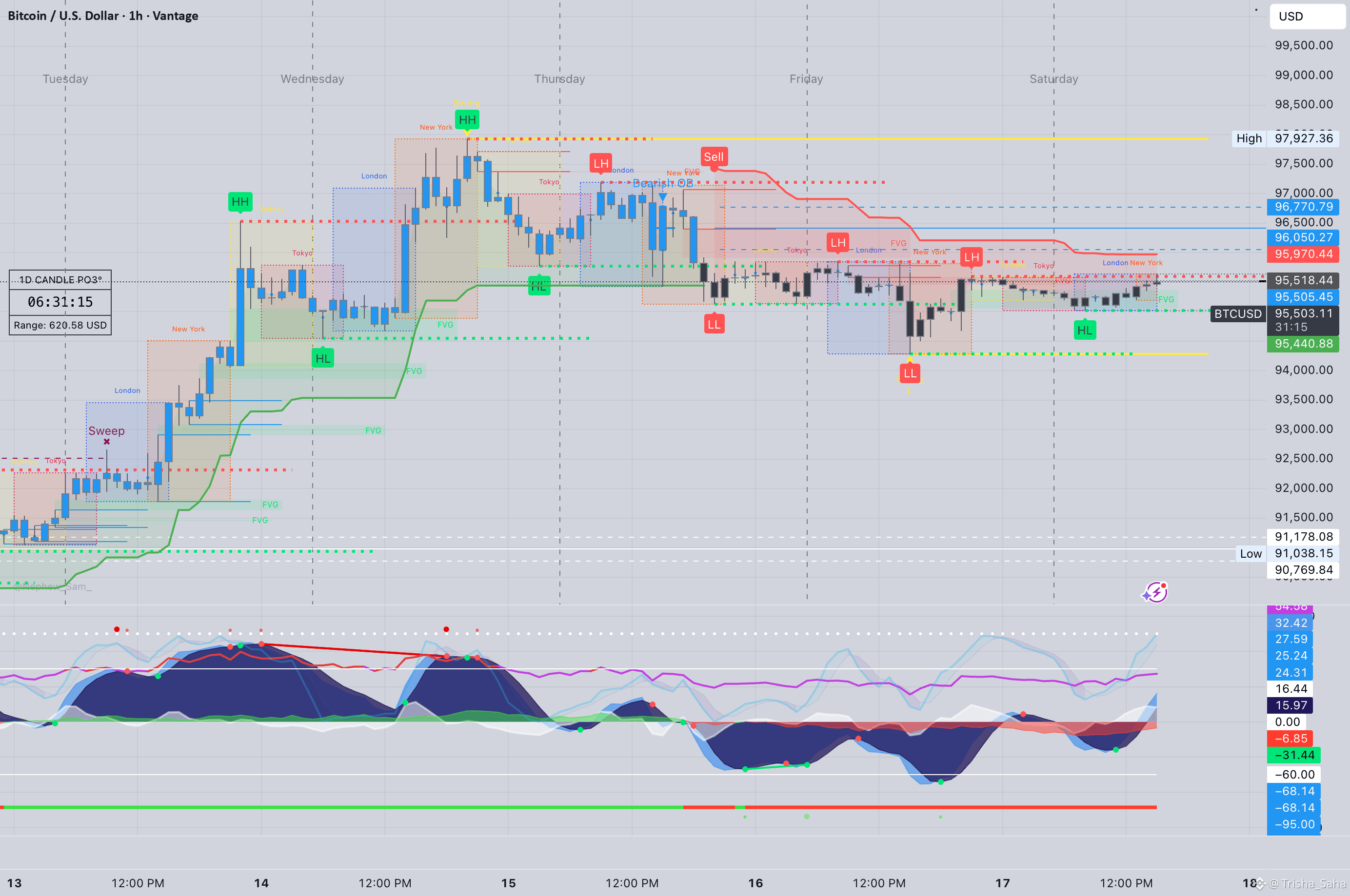 BTCUSD is trading around $94,800–$95,200 after a clear liquidity sweep below $93,600 and aggressive rejection back into range. The weekend price action shows absorption inside a daily discount zone with buyers defending the 50 EMA and prior structural low.