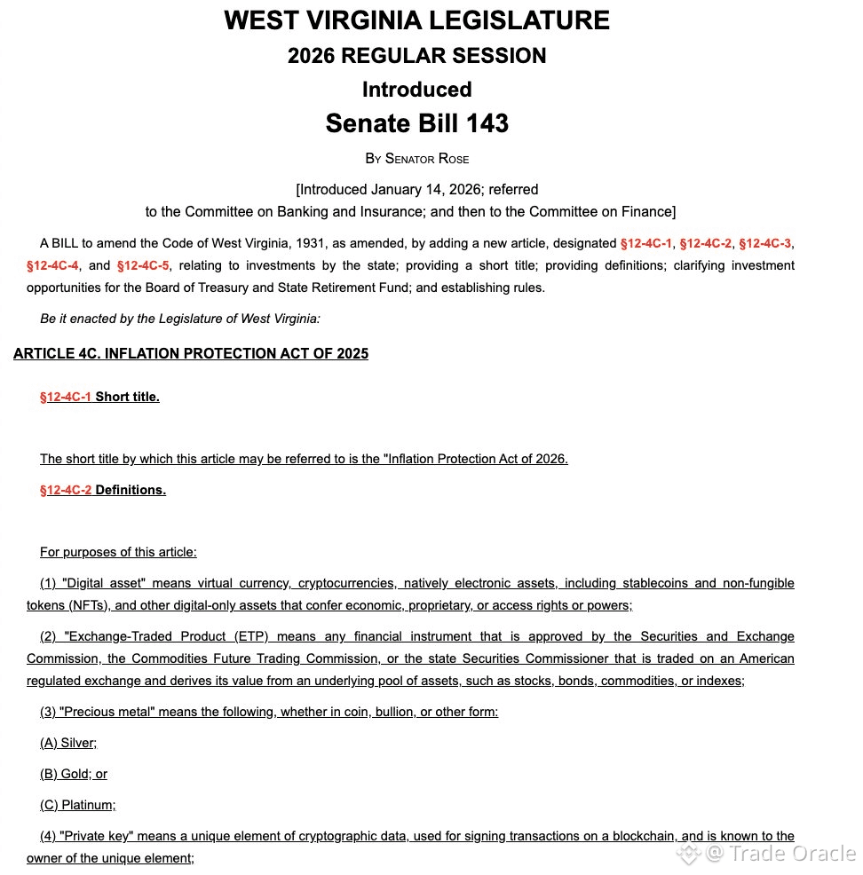 Big moves are happening in West Virginia! 🚀 The state has just introduced a new bill that could change the game for public treasury investments. 💼✨ Under this legislation, the state treasury can invest up to 10% of its funds in precious metals 🪙 and digital assets 💻, but only those with a market cap over $750 billion 🌐💎.