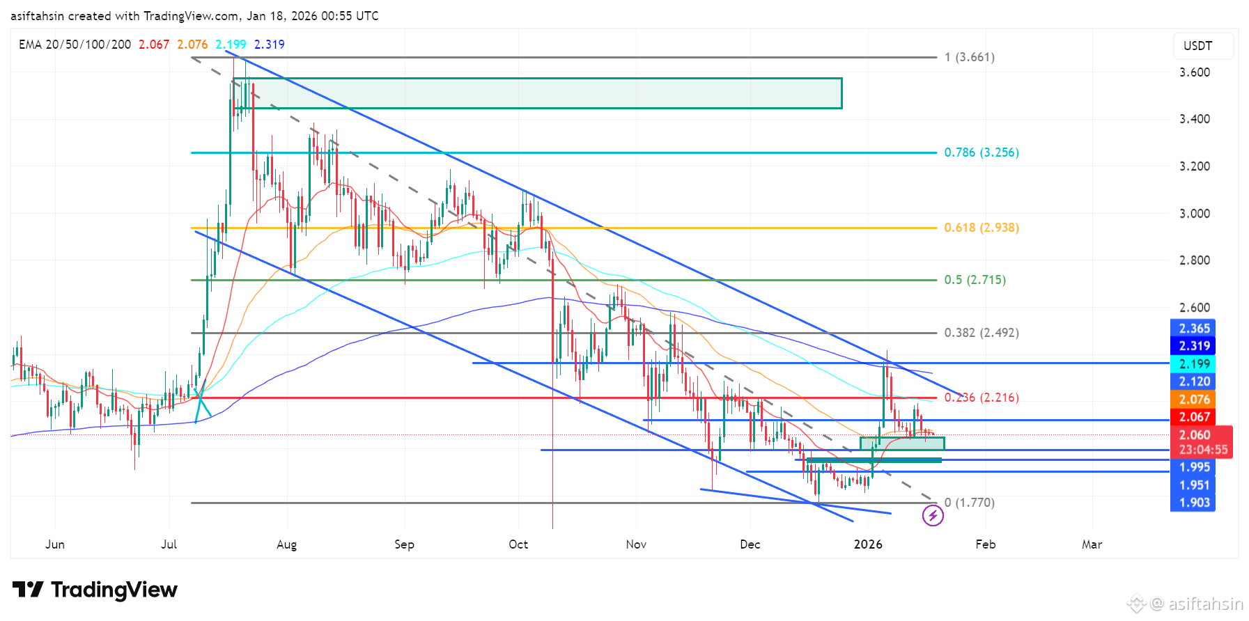 Failure to hold above $2.05–$2.00 would weaken the recovery structure and increase the risk of a retest of the $1.99–$1.77 macro demand zone.